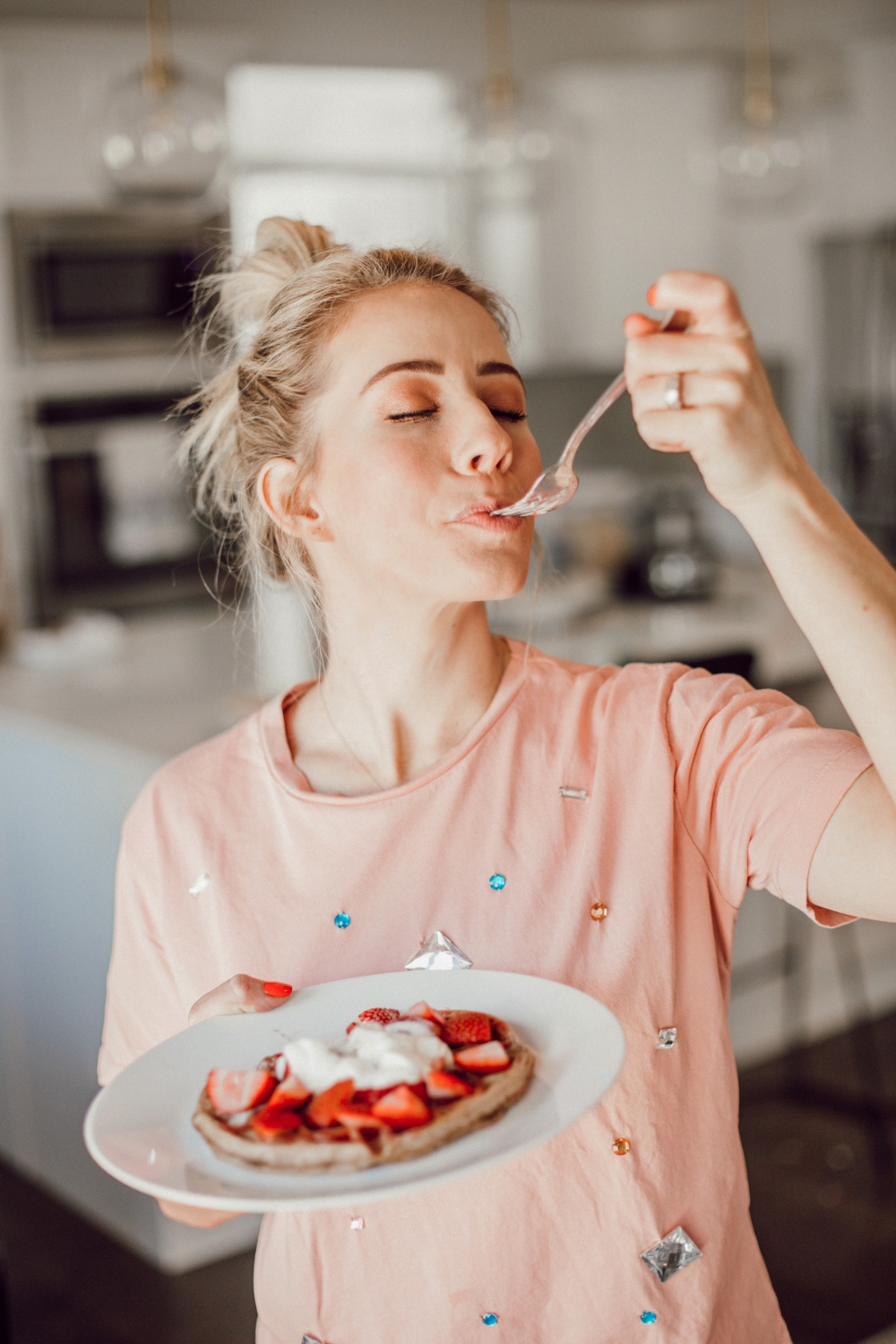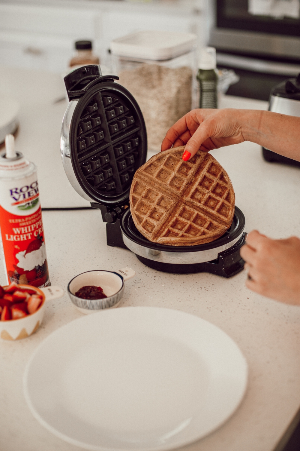 Now blend it up! I usually let my Blendtec run for about a minute or so and while it’s mixing I’ll prep my strawberries and turn on my waffle iron. I told you they were stupid easy. I made a quick video of the whole process over on my instagram account I’ve started with my sister. We are sharing our favorite healthy meals and workouts, if that interests you go check it out, it’s @2sisterstrong.
