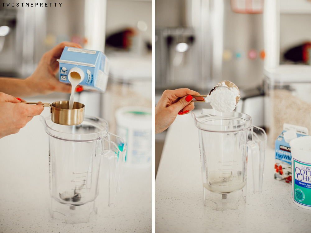 First, add 1/3 cup of egg whites and 1/3 cup of low fat cottage cheese to your blender.