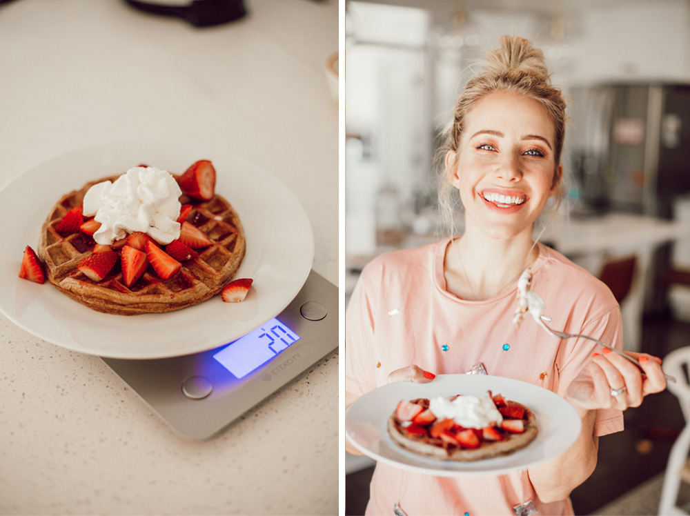 Now you don’t need to load yours with strawberries and low-fat whipped cream like I do. I have more carbs than fat in my macros so I’ve nixed the butter and syrup and opted for a tiny bit of jam, strawberries and 20 grams of low fat whipped cream. These are delicious though with peanut butter and bananas on them or maybe you’d rather some lite syrup with eggs and bacon. However you choose to eat your waffle is up to you, what’s important is that you know how to make them and store them so when those cravings hit you’re covered with something delish.