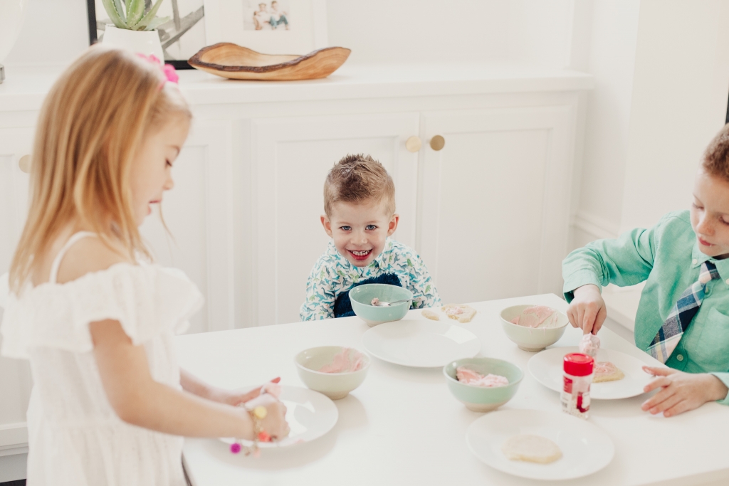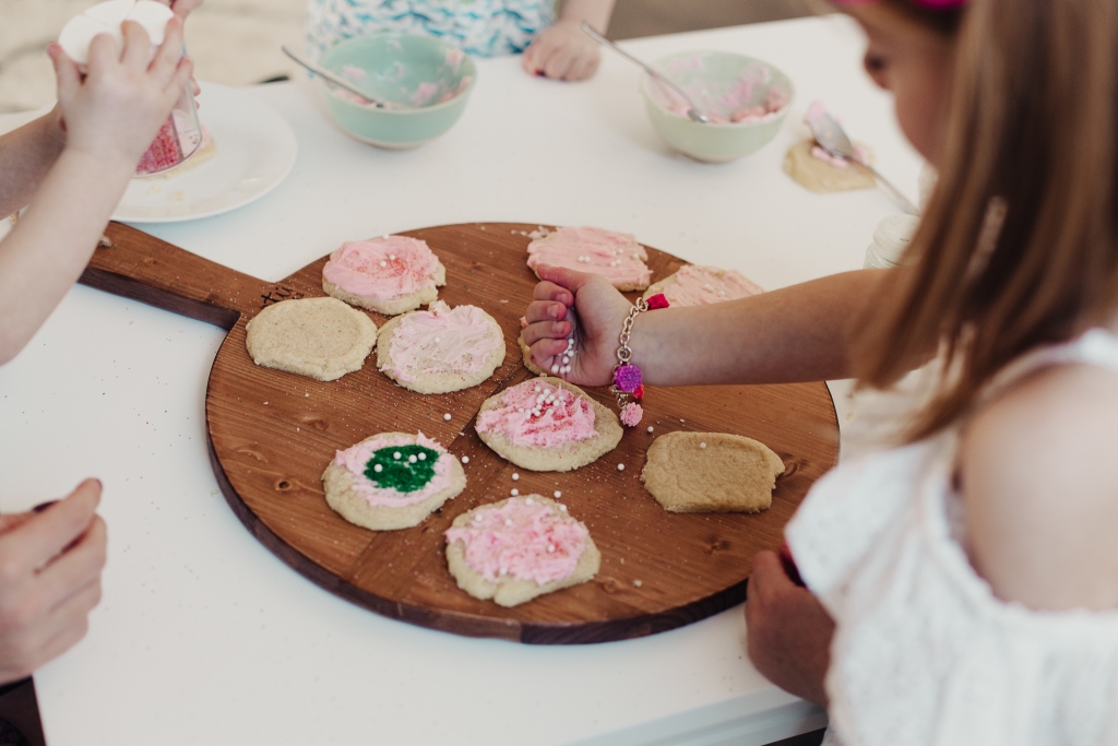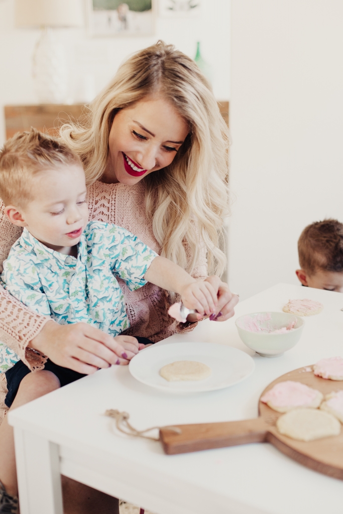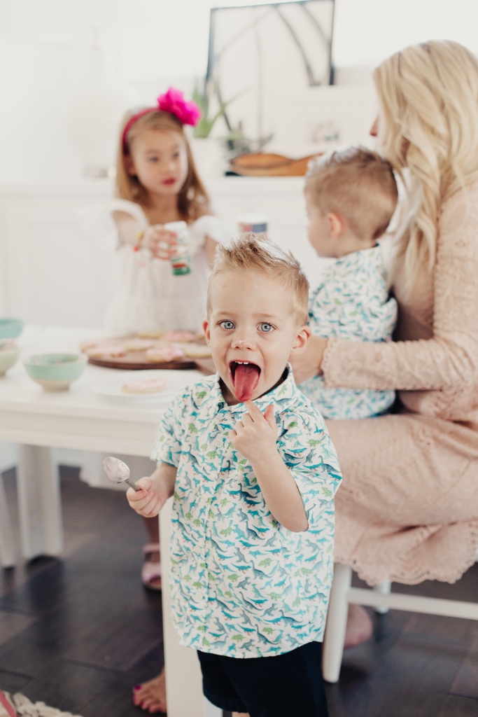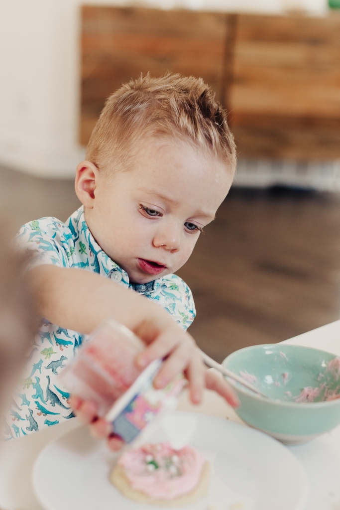 We made the frosting, I set the kids up on their little table and just let them at it! I usually have a couple different colors of frosting but we ran out of powdered sugar so pink had to do. And then I’ll let them use sprinkles and whatever else they can find in my baking bucket. The music is up and Savy has a blast bossing her brothers around and giving them specific instructions on how to properly frost and decorate a sugar cookie! I’m always so inspired by my kids. How creative they are, always wanting to stand out and put their personal little flair on things!
