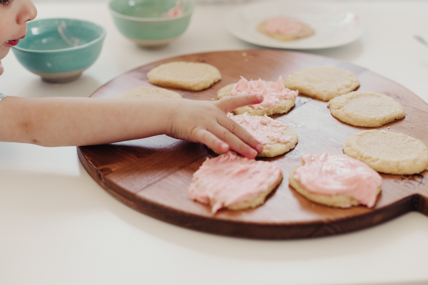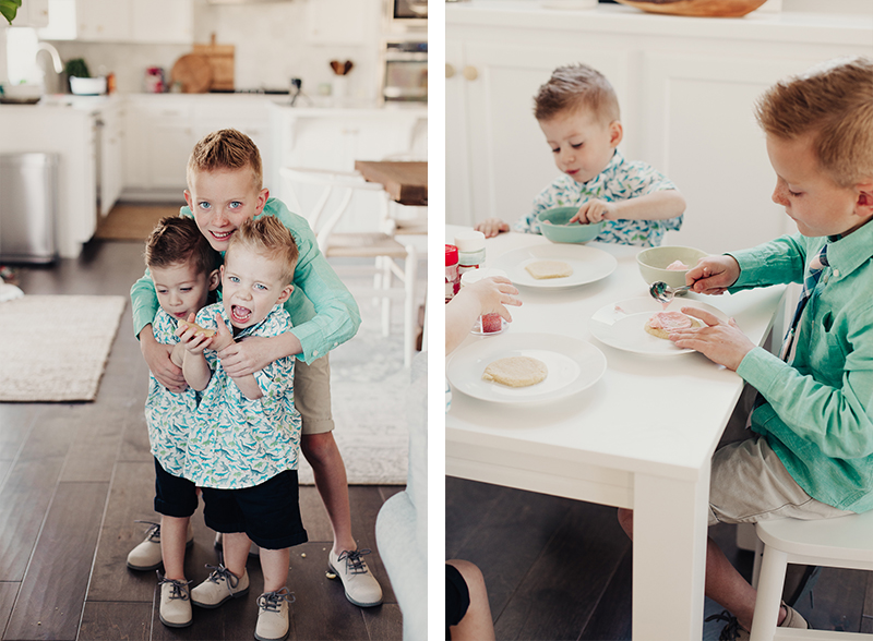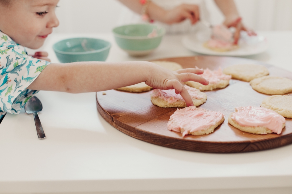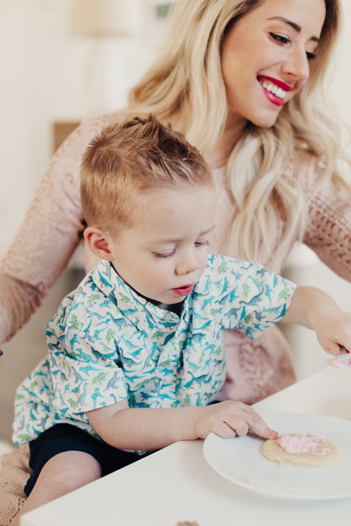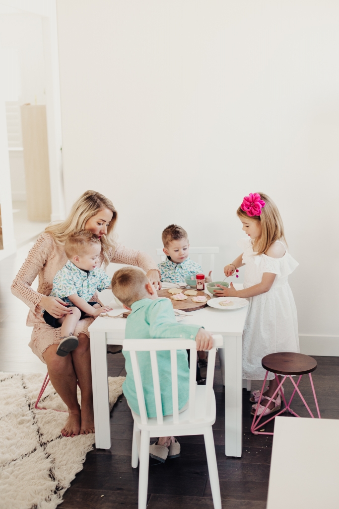 We made the frosting, I set the kids up on their little table and just let them at it! I usually have a couple different colors of frosting but we ran out of powdered sugar so pink had to do. And then I’ll let them use sprinkles and whatever else they can find in my baking bucket. The music is up and Savy has a blast bossing her brothers around and giving them specific instructions on how to properly frost and decorate a sugar cookie! I’m always so inspired by my kids. How creative they are, always wanting to stand out and put their personal little flair on things!
