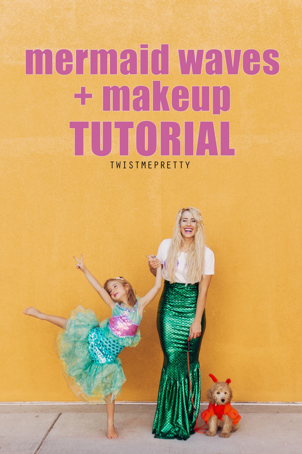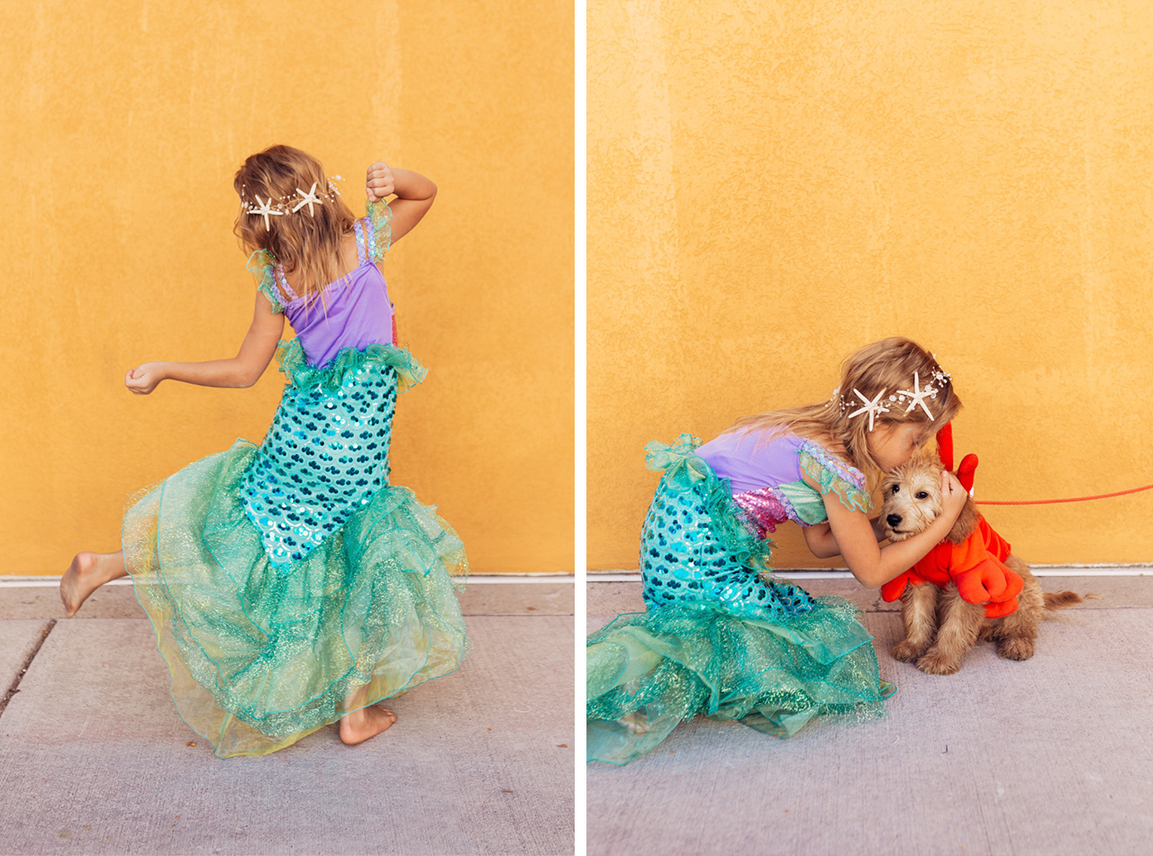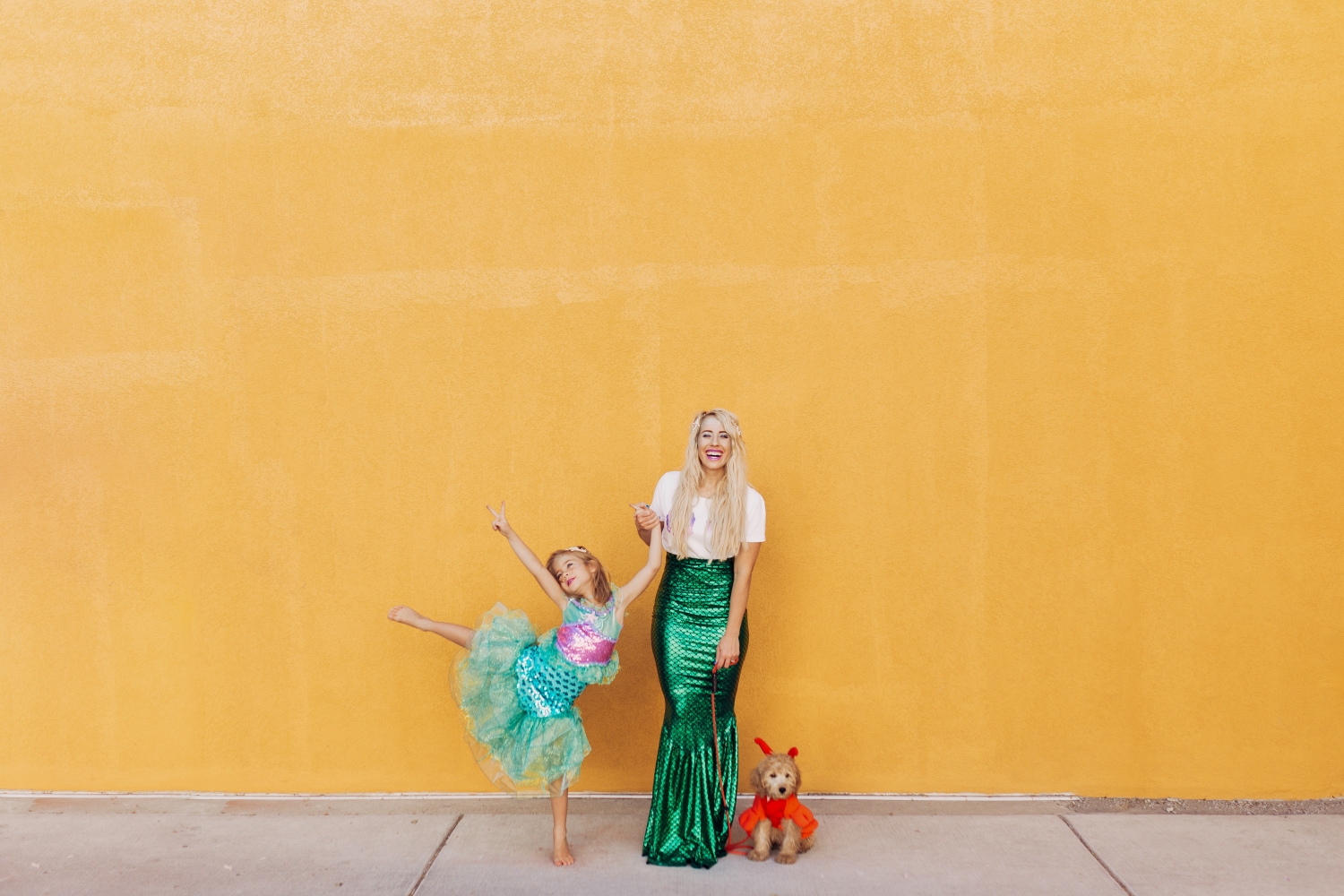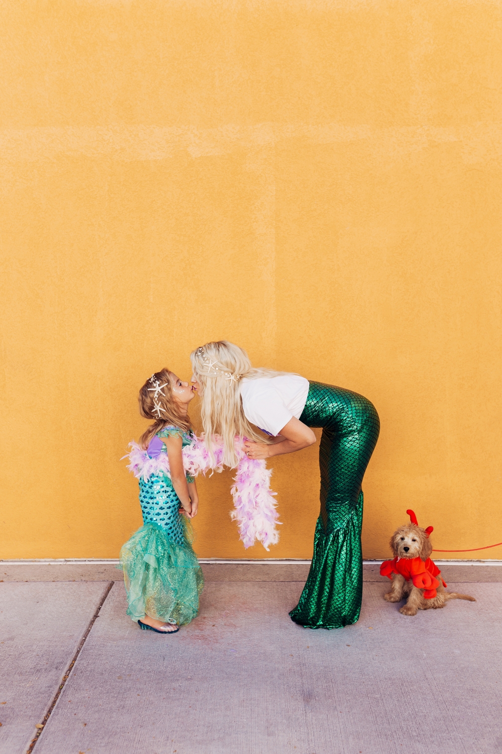 I’ve been so excited to share these costumes with you, does it get any cuter than mommy/daughter mermaids and a CRAB PUPPY?! No. Not it does not! Today I’m sharing how to get these gorgeous mermaid waves and also a super easy makeup tutorial using a couple bright colors and some fishnets. I hope you have some time to kick back and relax for a minute because Savy is also sharing the story of the Star Queen Princess… which is amazing. You won’t want to miss it!