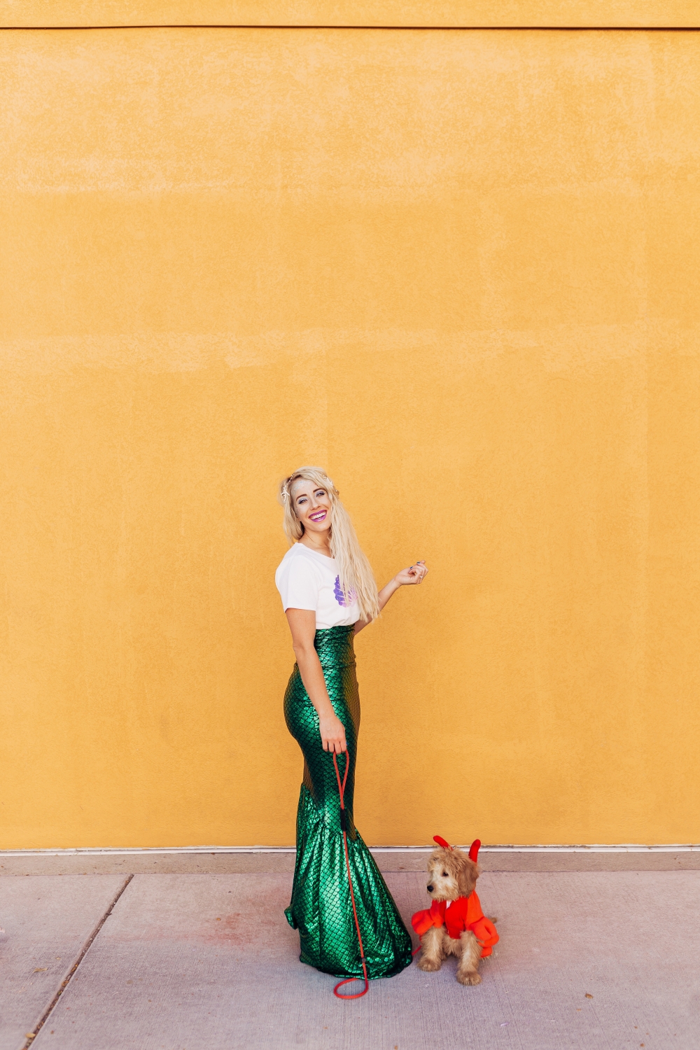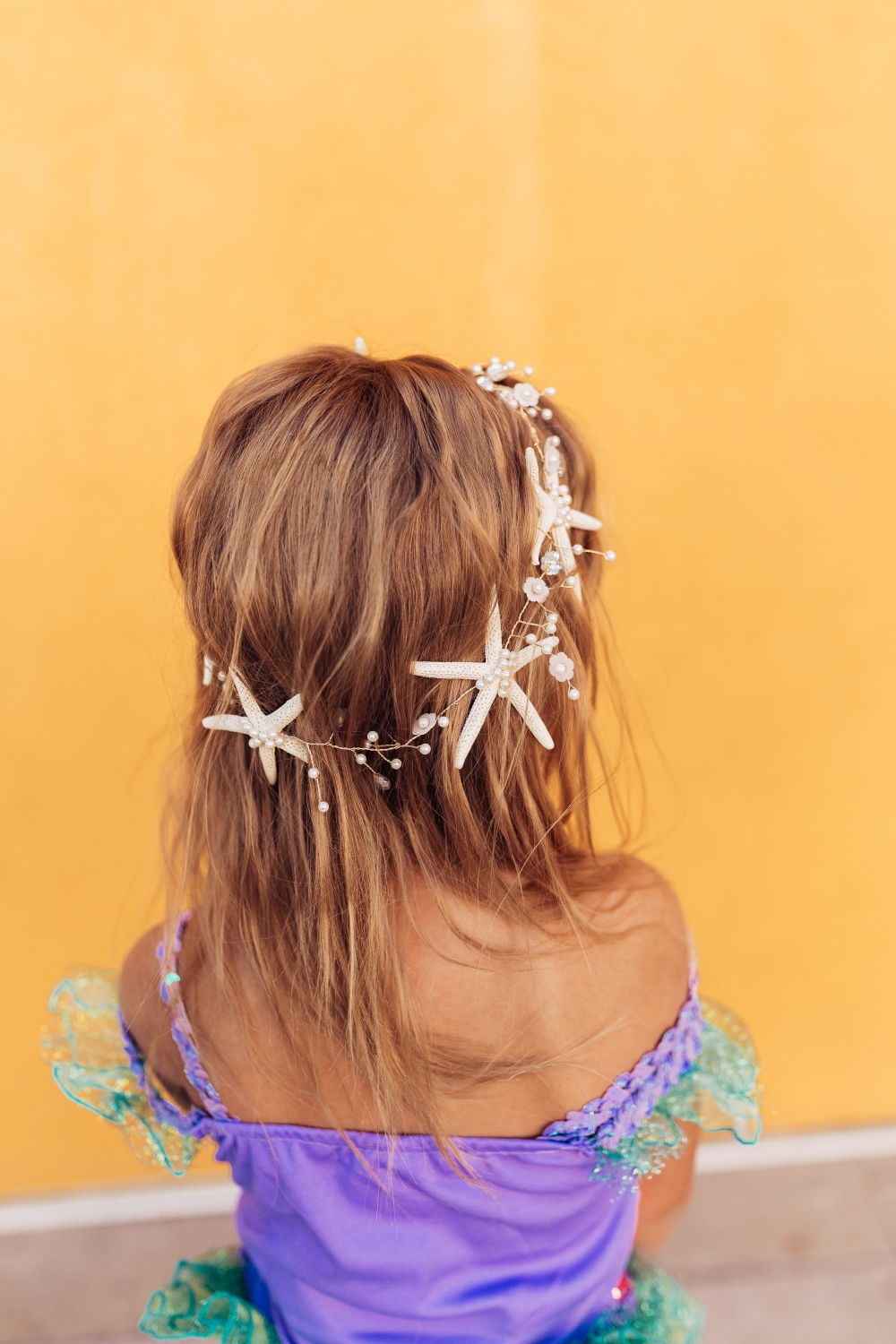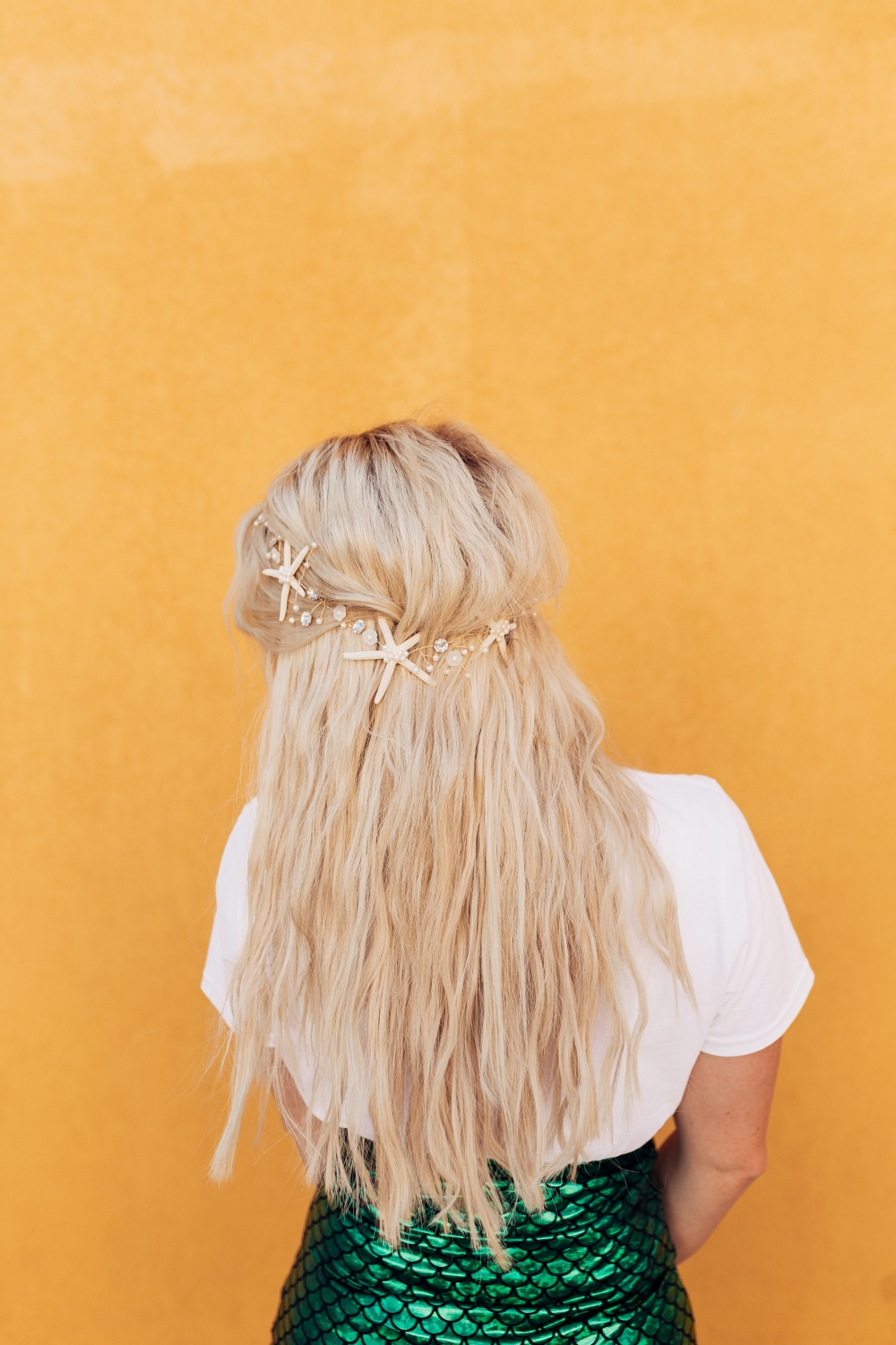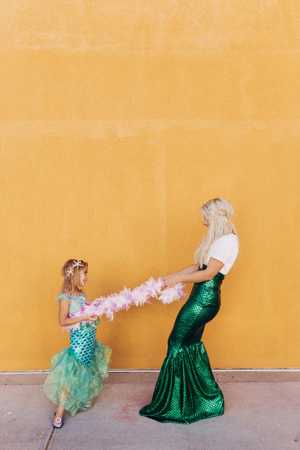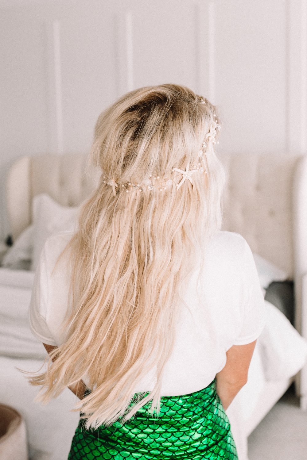 I’ve been so excited to share these costumes with you, does it get any cuter than mommy/daughter mermaids and a CRAB PUPPY?! No. Not it does not! Today I’m sharing how to get these gorgeous mermaid waves and also a super easy makeup tutorial using a couple bright colors and some fishnets. I hope you have some time to kick back and relax for a minute because Savy is also sharing the story of the Star Queen Princess… which is amazing. You won’t want to miss it!