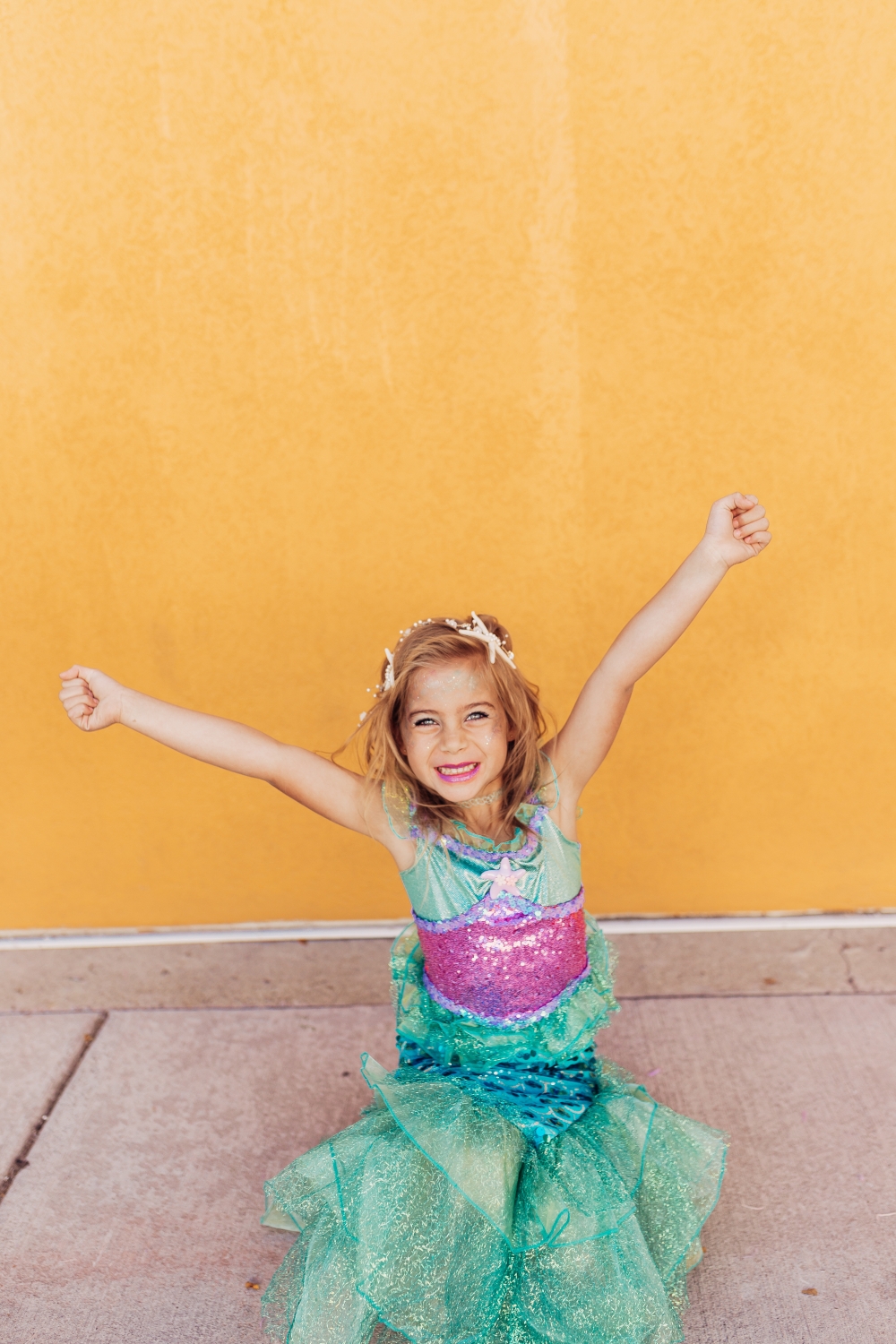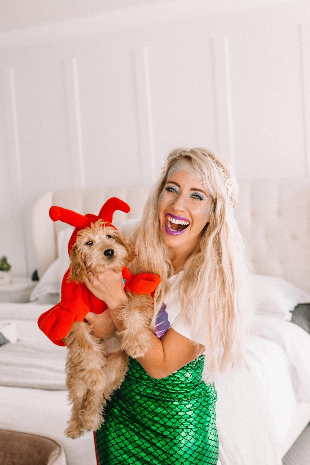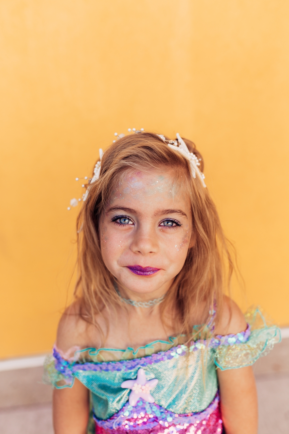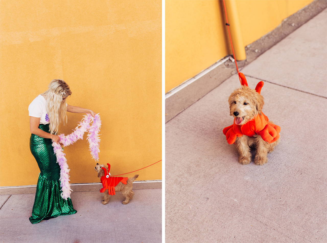 I’ve been so excited to share these costumes with you, does it get any cuter than mommy/daughter mermaids and a CRAB PUPPY?! No. Not it does not! Today I’m sharing how to get these gorgeous mermaid waves and also a super easy makeup tutorial using a couple bright colors and some fishnets. I hope you have some time to kick back and relax for a minute because Savy is also sharing the story of the Star Queen Princess… which is amazing. You won’t want to miss it!