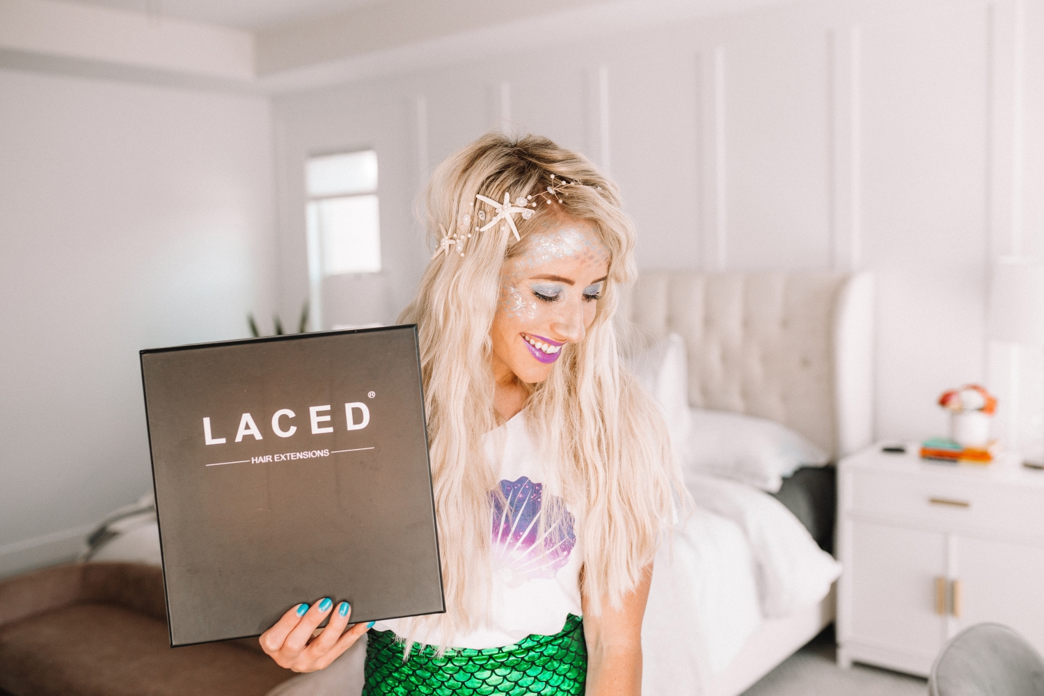 Let’s chat about this long mermaid hair for a second. OBVIOUSLY it’s not all mine! I’m wearing the clip-in extensions from Laced Hair and they come highly recommended from yours truly. I wanted to share some quick advise on extensions. Please don’t buy cheap hair!!! It’s worth the investment to get quality hair because they’ll 1. last you forever. I wear extensions quite often and have had the same set of clip-ins for over a year. Quality hair won’t mat or dull over time and you can also dye it. My big secret is to take my bag of extensions to my stylist and have her smudge the roots. She’ll also tone the blonde with the same toner she uses on my hair. I also have her trim up the hair and blend it with my own. It’ll cost you a bit more but I promise you’ll feel more confident wearing your new extensions. They’ll blend flawlessly and the color will be exact. If your blonde, the smudge will help hide the tracks and I rarely put extensions in above my ears. There’s nothing wrong with wearing a head full of extensions, but you better make sure NO ONE can see the tracks!! So my advice is if you’re going to buy some extensions, just do it right and buy a nice set that will last you forever and spend the extra $ to really make them your own.