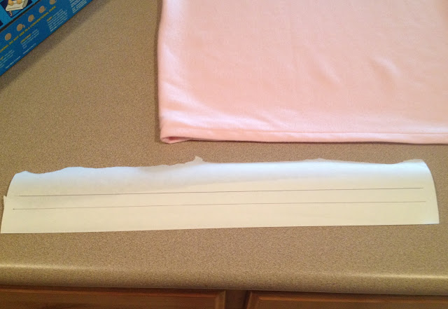 Step 1. Cut a three-inch wide strip of freezer paper, and with a pen and ruler, draw two straight lines about 1/4″ apart, as seen below. Make sure to draw on the matte side, not the shiny side.