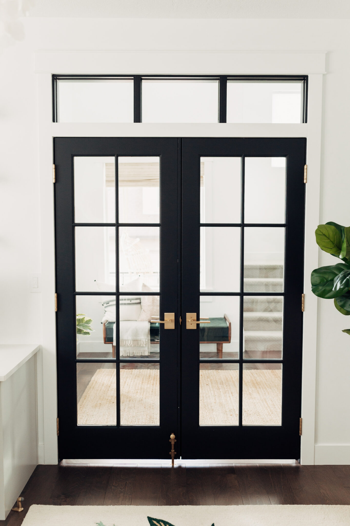 Project number two was adding in those black office doors + transom window. This was truly a PAIN IN THE BUTT. The doors were cut the wrong size our first go around. We had to wait another 12 weeks (it literally takes forever) before the new doors came in. After that we had to hire a painter, which wasn’t cheap, to come in and paint the dang things. In the end, it was totally worth it. I’m obsessed + the finishes are perfect.
