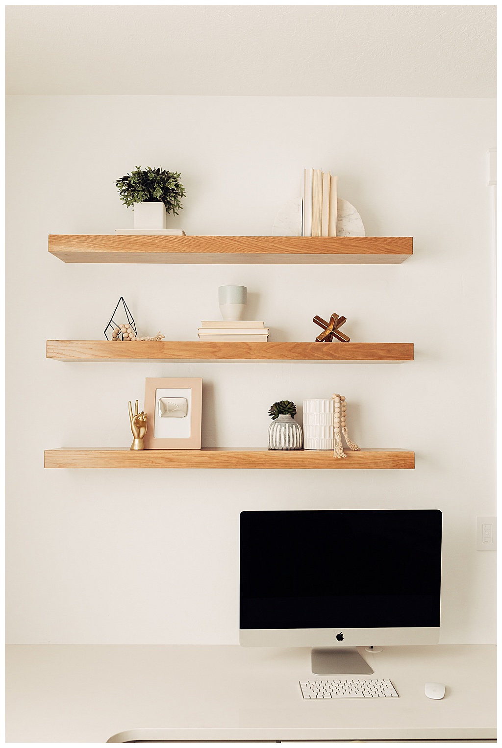 The fifth and final project was the quarter sawn white oak shelves. The contractor who did the floors, shelves and doors also made these shelves – he did an awesome job. I love the warmth they bring into the room and it allows me to style fun little decorations on them.