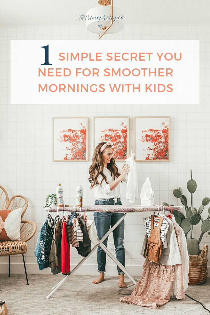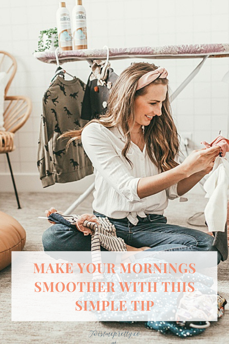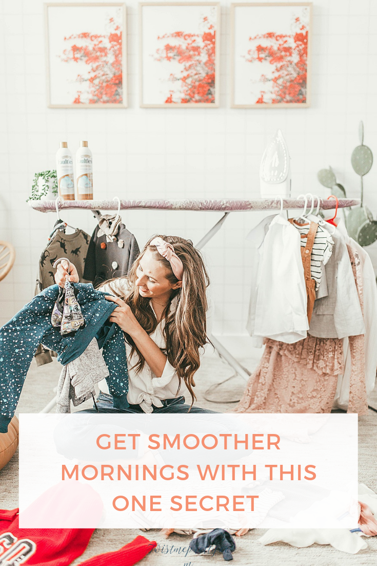 Something that I found has been game changing for our morning routine is to get both of my kids clothes out, hung up in complete outfits, and prepped for the entire week. This even includes ironing our clothes for church on Sundays.
