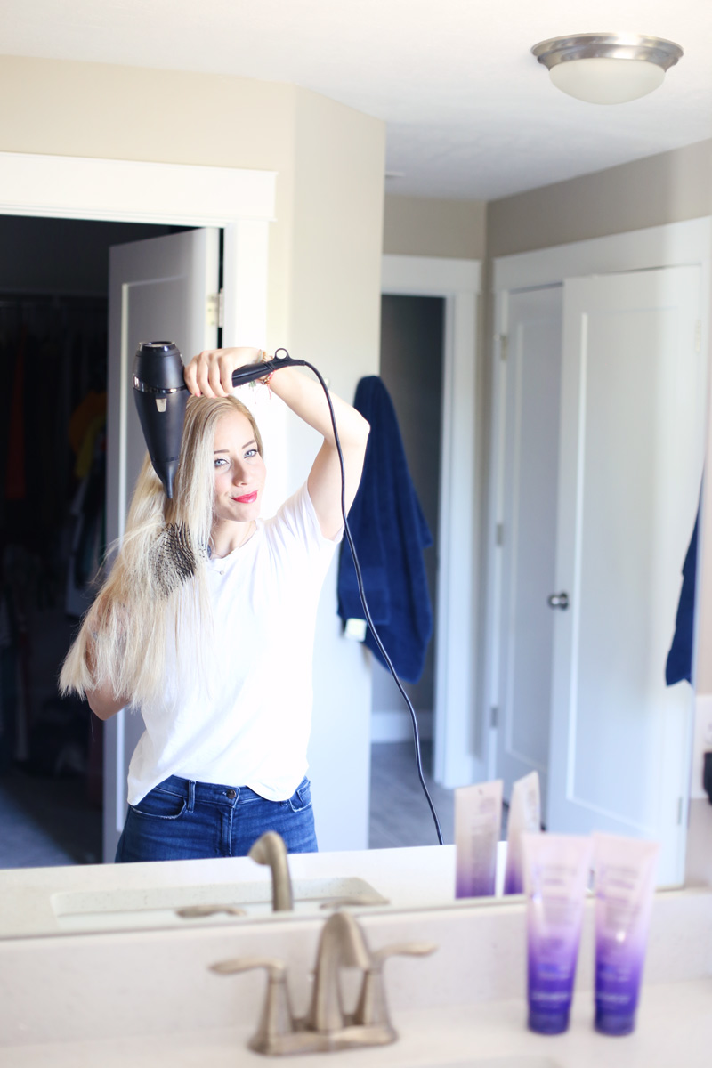 After I hopped out of the shower, I towel dried my hair and threw on some makeup. I like to let my hair air dry for a minute before I take the blow dryer to it because it speeds up my blow dry time and I end up using less heat. I use a paddle brush and concentrator nozzle to help eliminate frizz and to just give me a more purposeful blow dry.