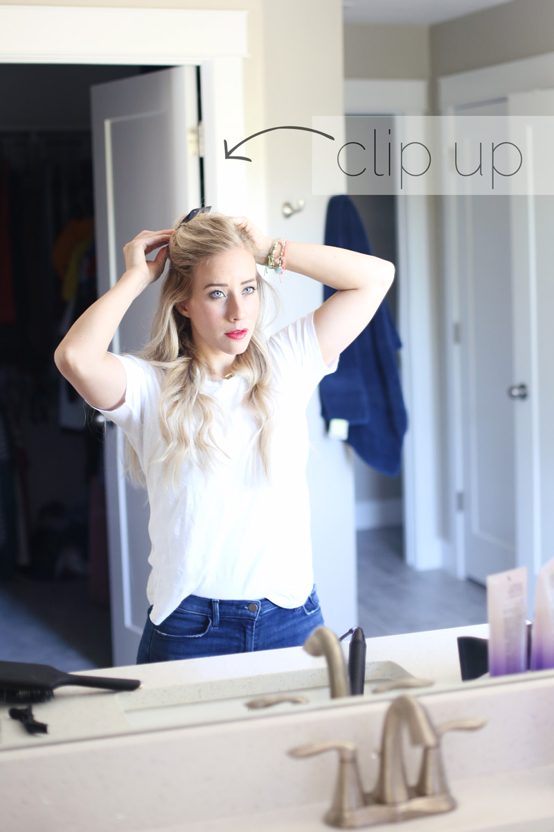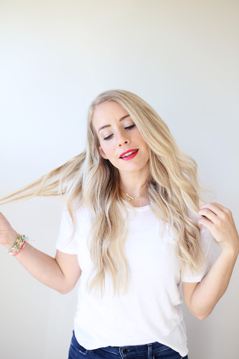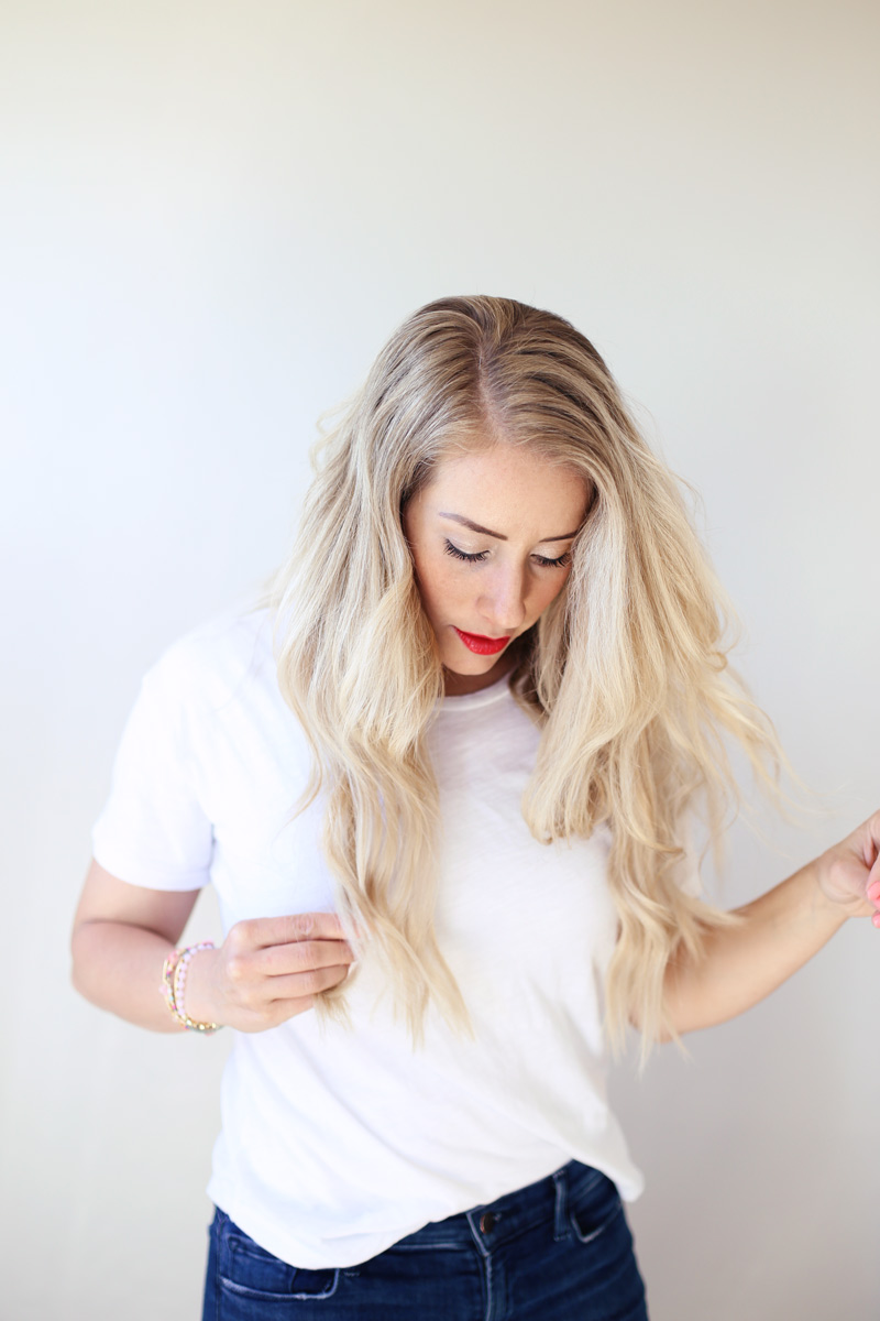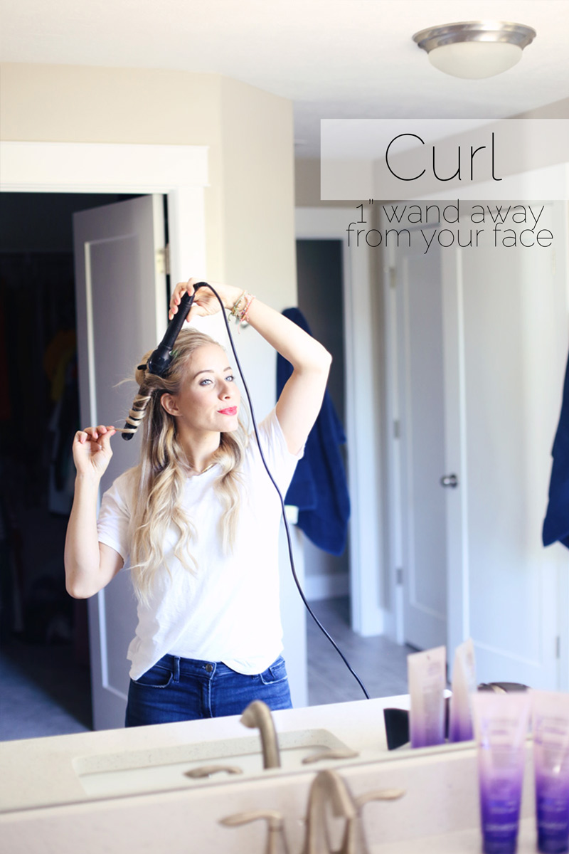Once it’s completely dry, I start on the curls!! I section my hair into about four layers and then curl small sections with a 1″ wand away from my face. You can find the video tutorial here if you need some extra help!