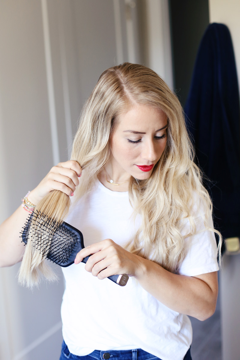 Afterwards the curls are pretty tight so I like to take my paddle brush and just brush through the hair, this helps loosen up the curls and makes the style look a little more effortless! Alternatively you could use a larger wand, but I like to use the 1″ size because I feel like my curls last longer.