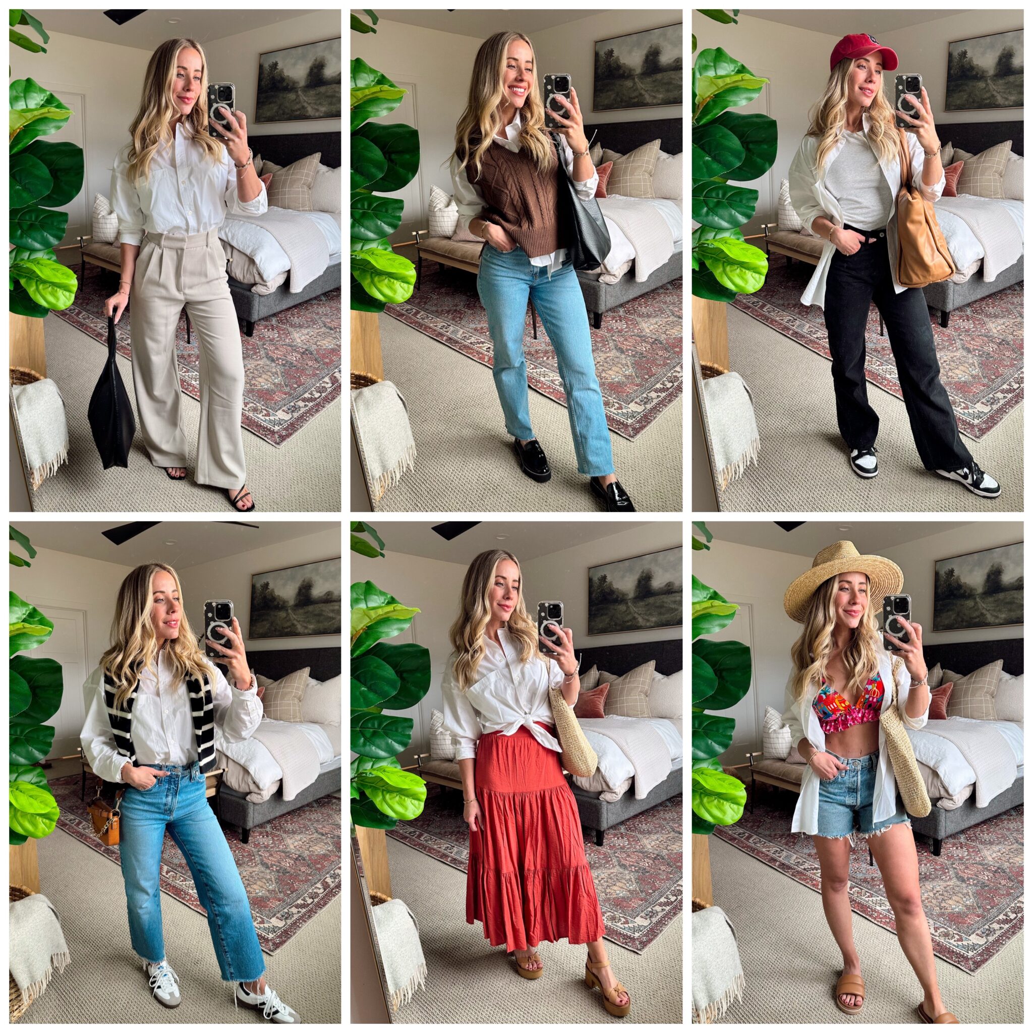 So, after many, many, online orders… and returns! And then several hours of trial and error in front of my mirror, I’ve finally figured out 6 ways you can style a classic white button up shirt! I am loving the different ways and I hope they give you some inspo too.