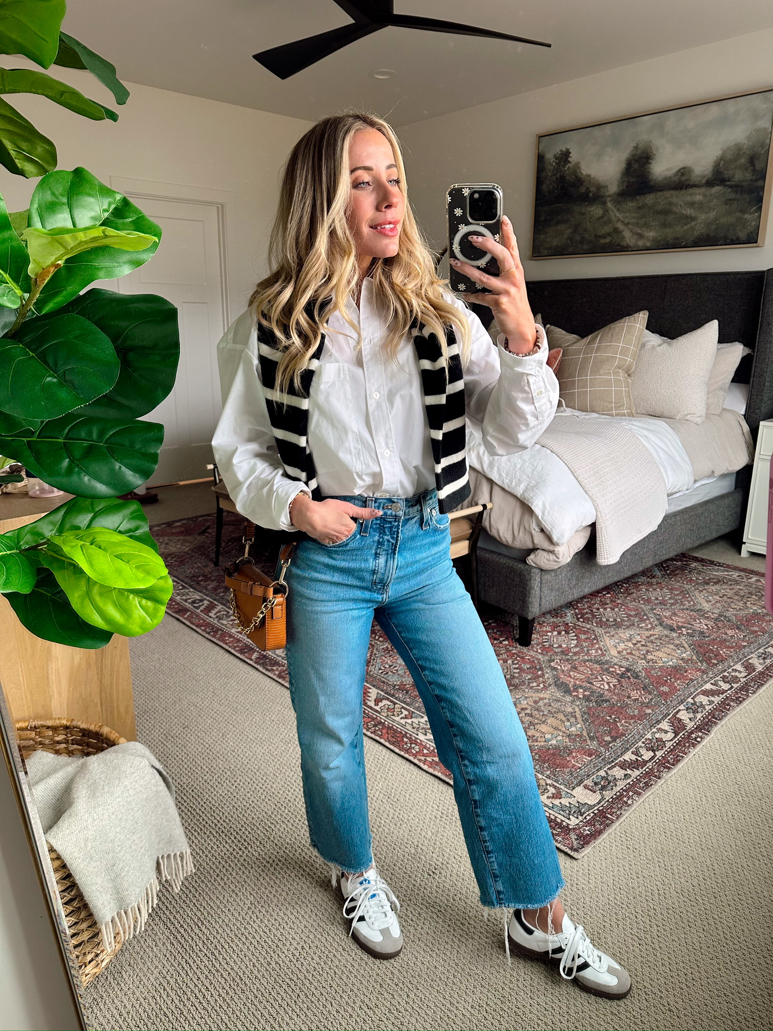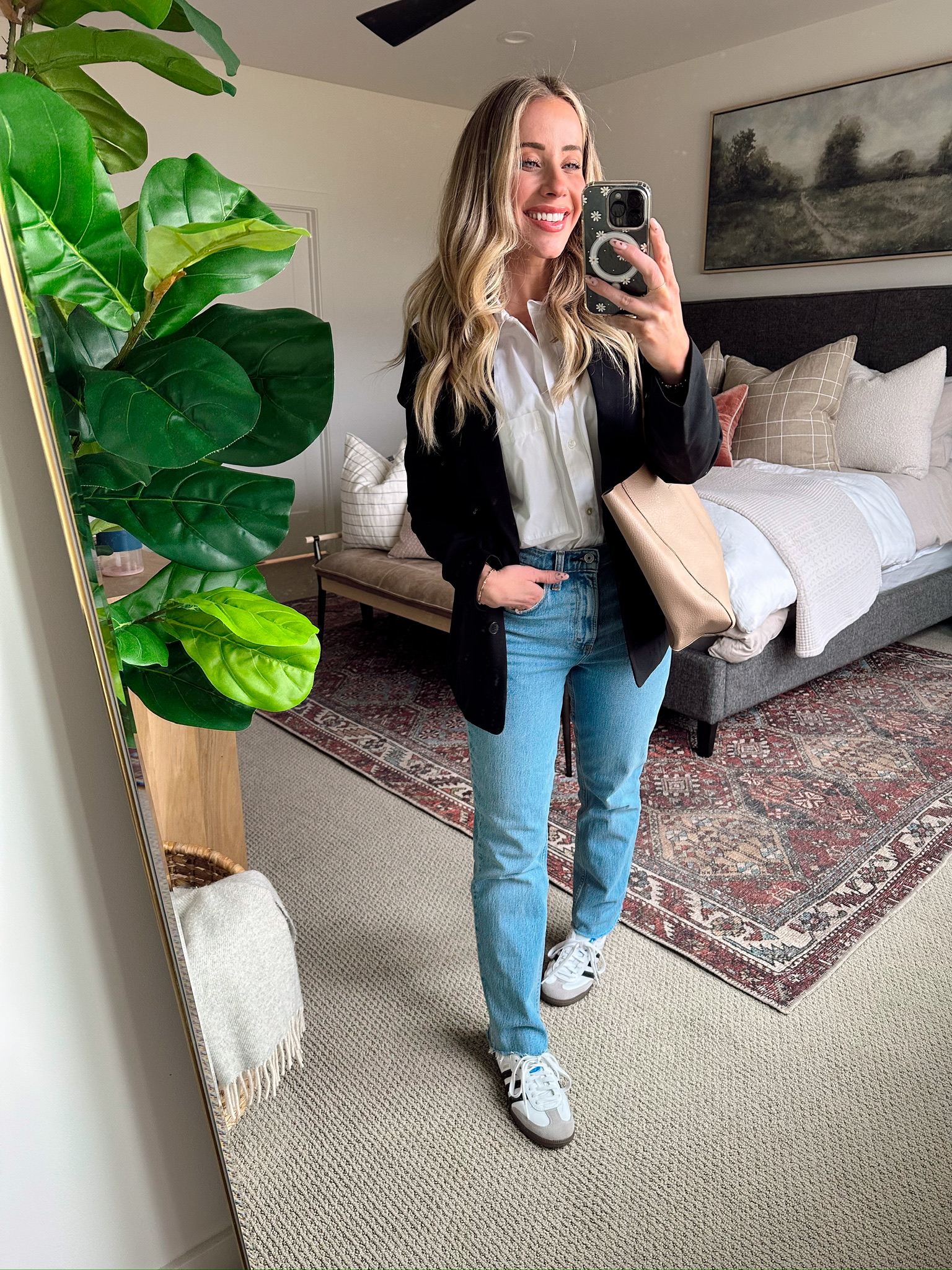 BUTTON UP / BLAZER / SWEATER / JEANS / SAMBAS / TAN BAG / BROWN BAG (sold out, similar linked)