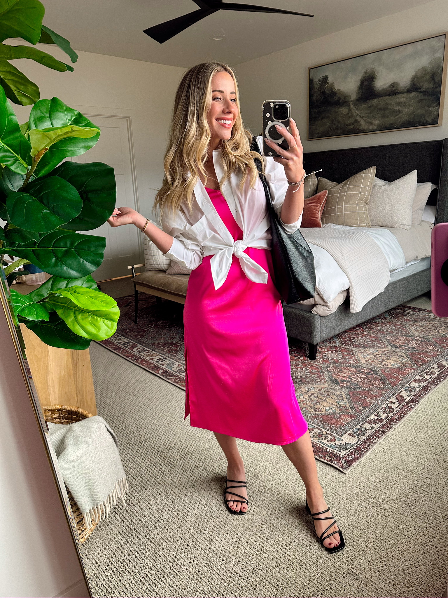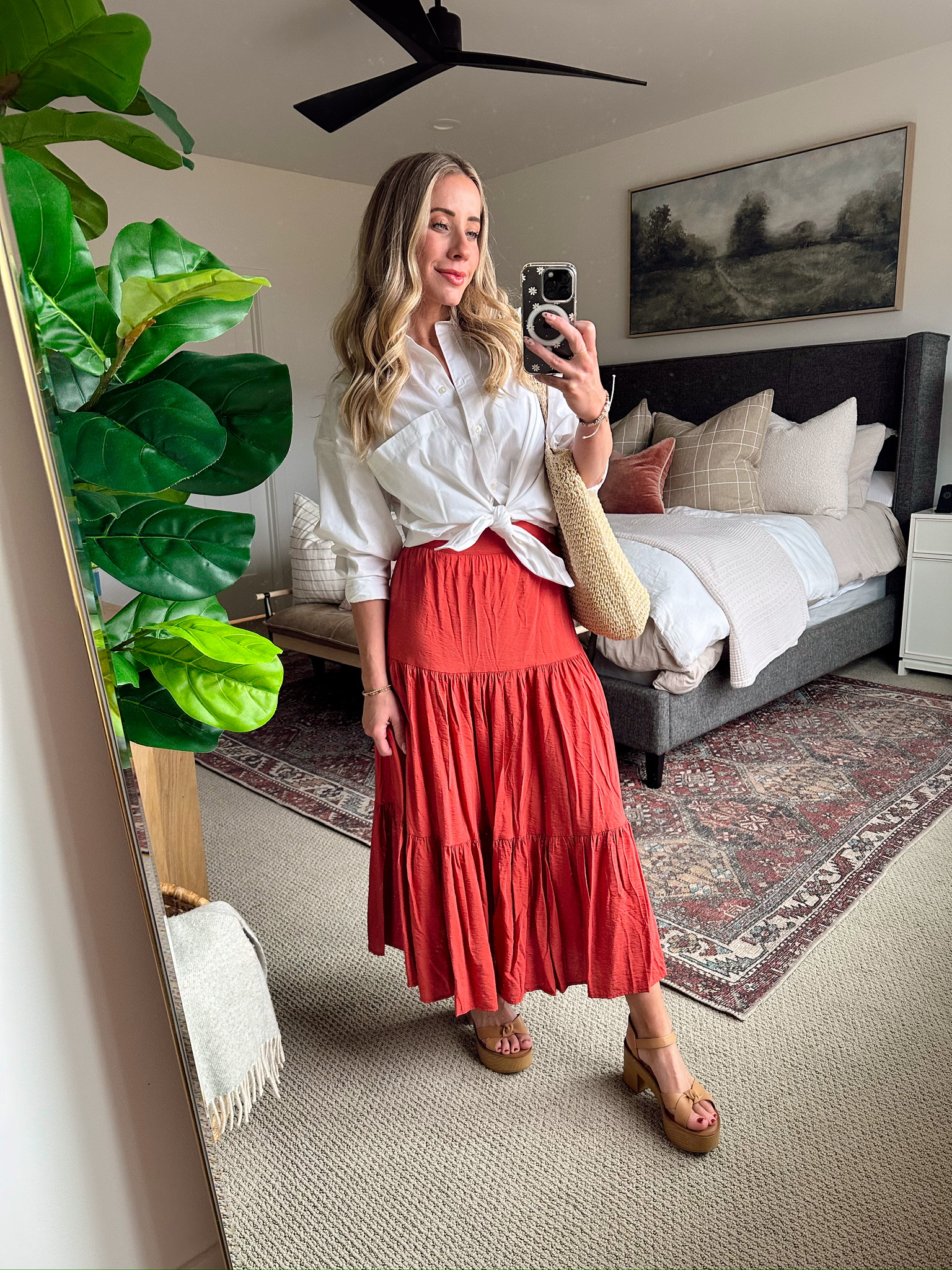 BUTTON UP / SILK DRESS / STRAPPY HEELS / BLACK BAG / RED MAXI SKIRT / PLATFORM SANDAL (out of stock, linked similar) / STRAW BAG