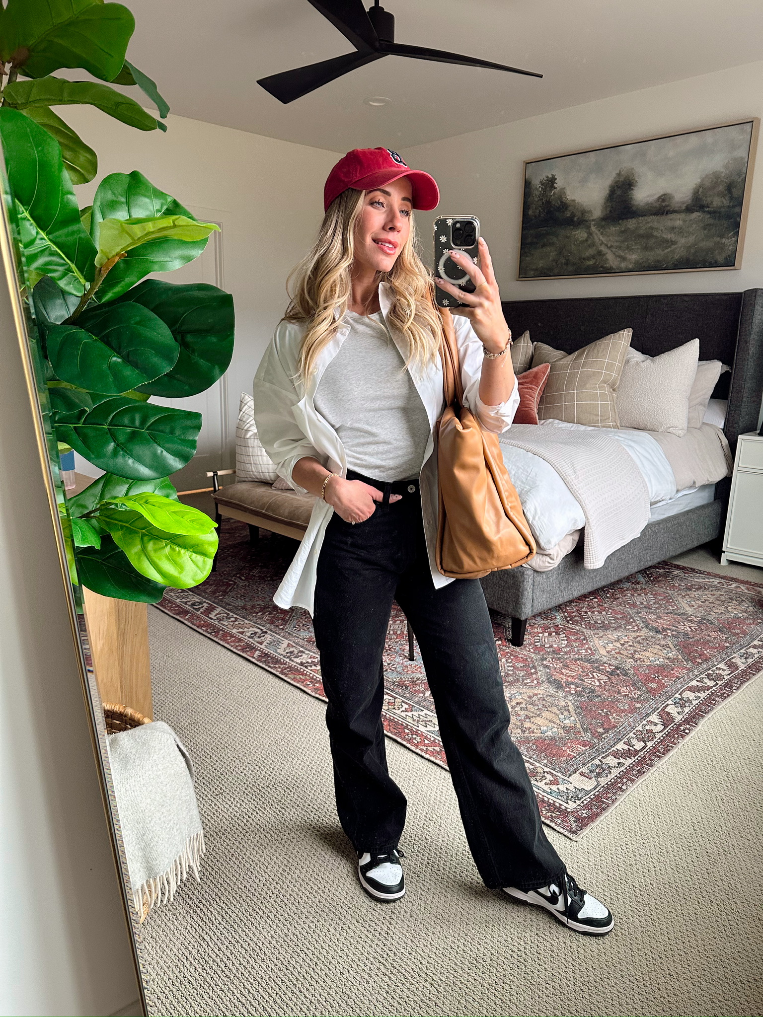 BUTTON UP / BLACK JEANS / GREY T SHIRT / RED HAT / TAN BAG / BLACK AND WHITE DUNKS
