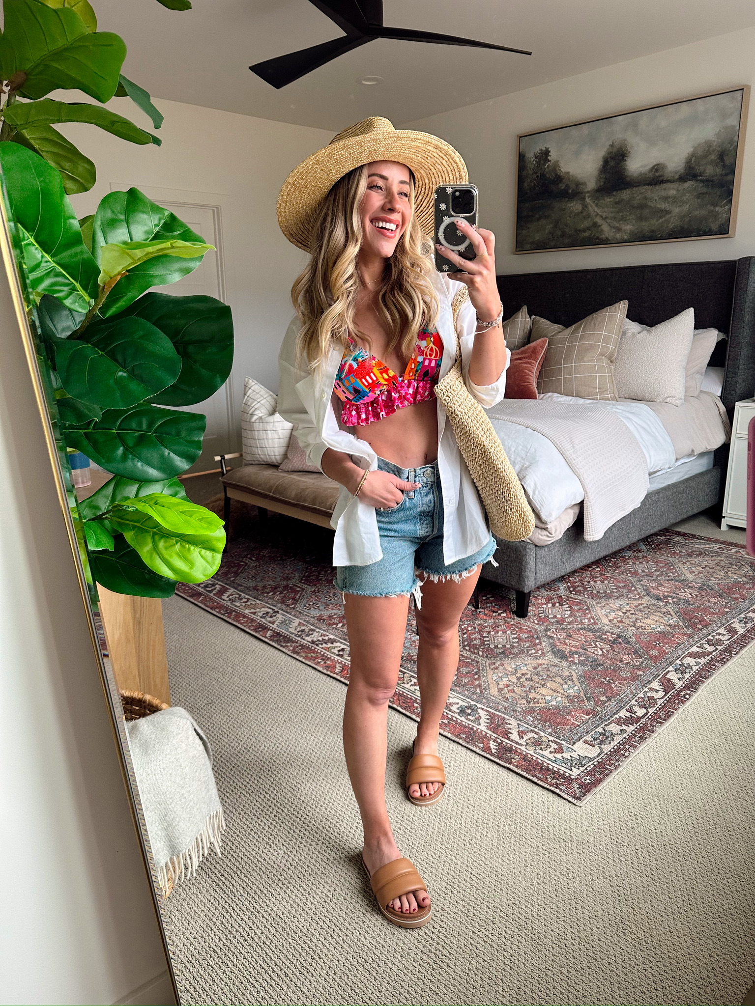 BUTTON UP / SWIMSUIT / JEAN SHORTS / STRAW HAT / STRAW BAG / TAN SANDALS