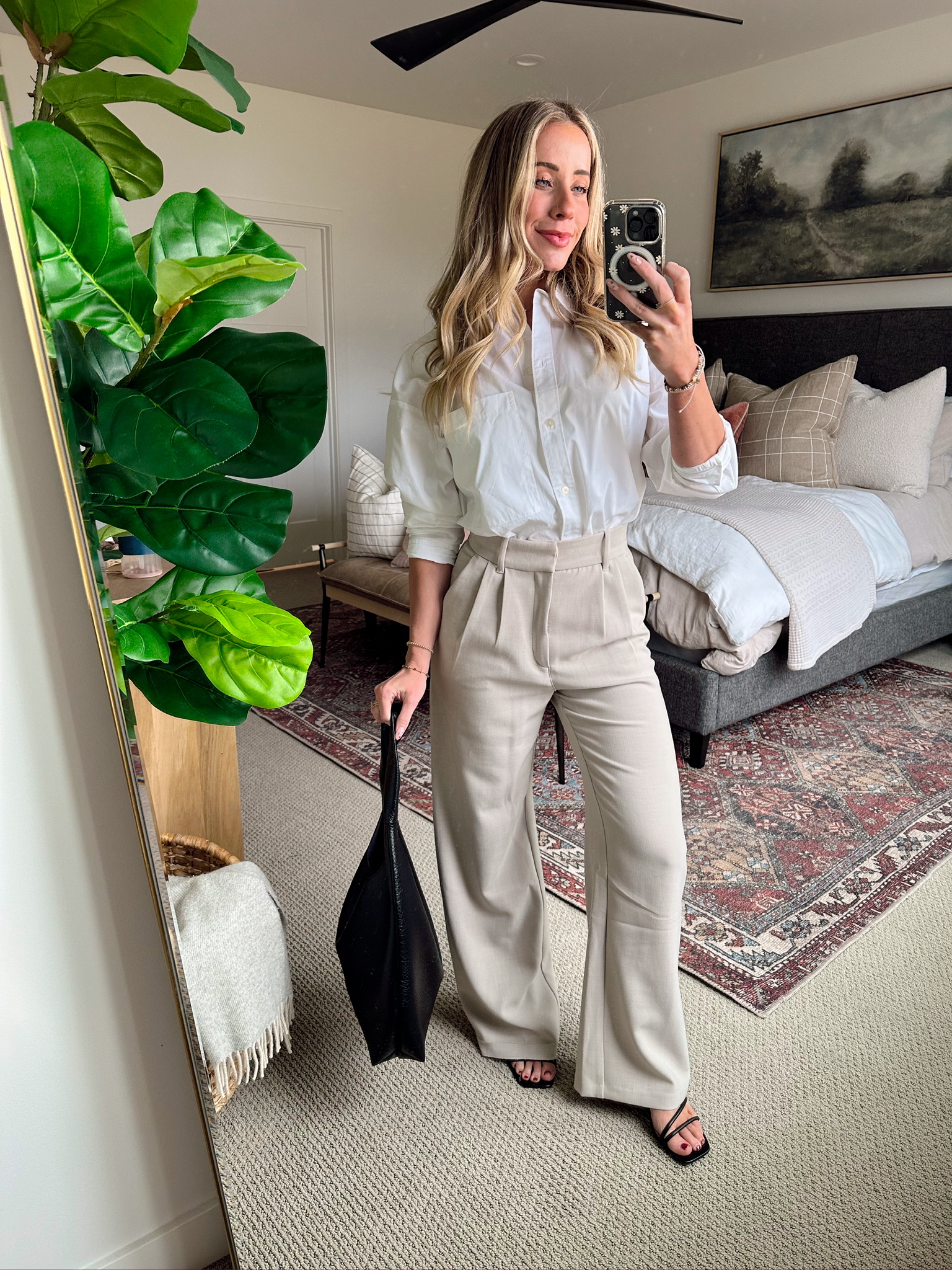 I love these trousers because they give such a cool, pulled together vibe! It may be my favorite way to style a white button down shirt! The cream jeans are also so fun, because they keep that light, monochromatic look, which is super in for spring and summer, and even into fall!
