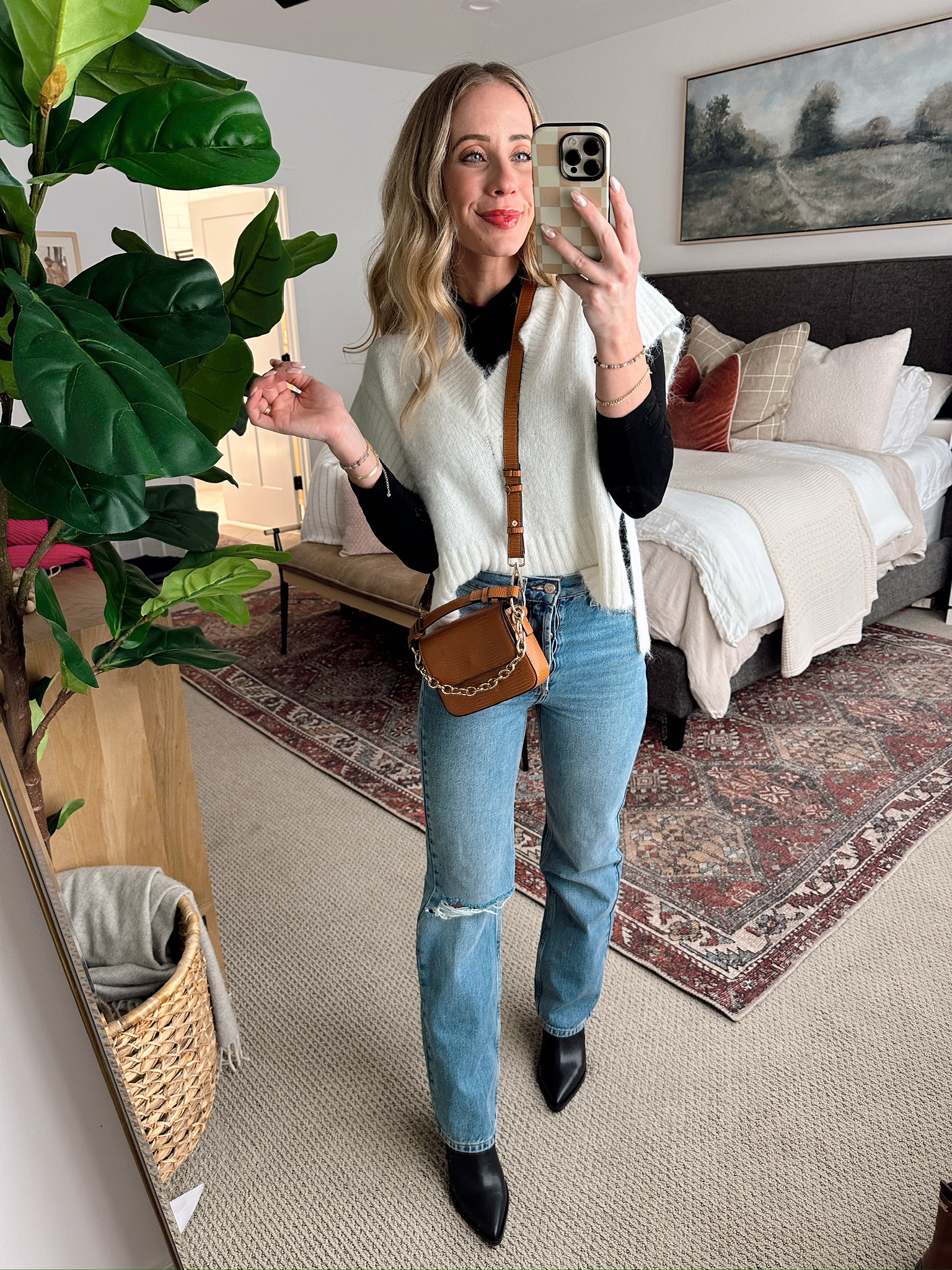 CREAM V NECK SWEATER / BLACK LONG SLEEVE / JEANS / BLACK WESTERN BOOTS / BROWN PURSE