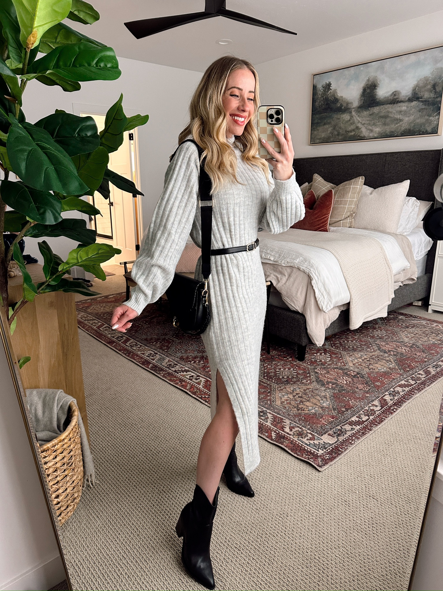 GREY SWEATER DRESS / BLACK BELT / BLACK WESTERN BOOTS