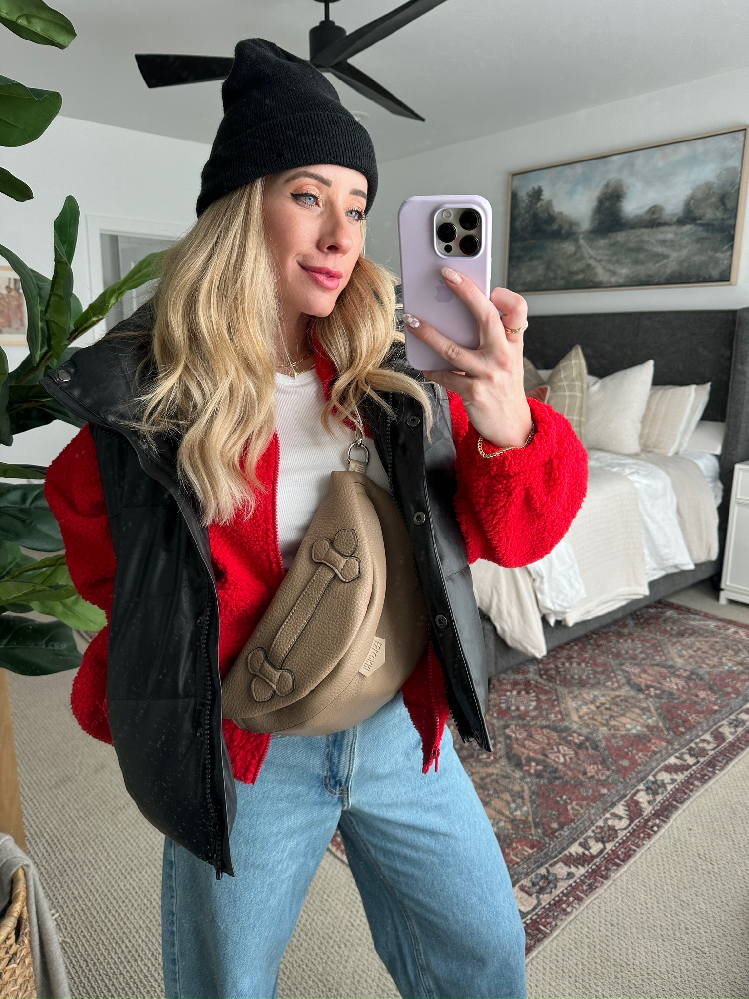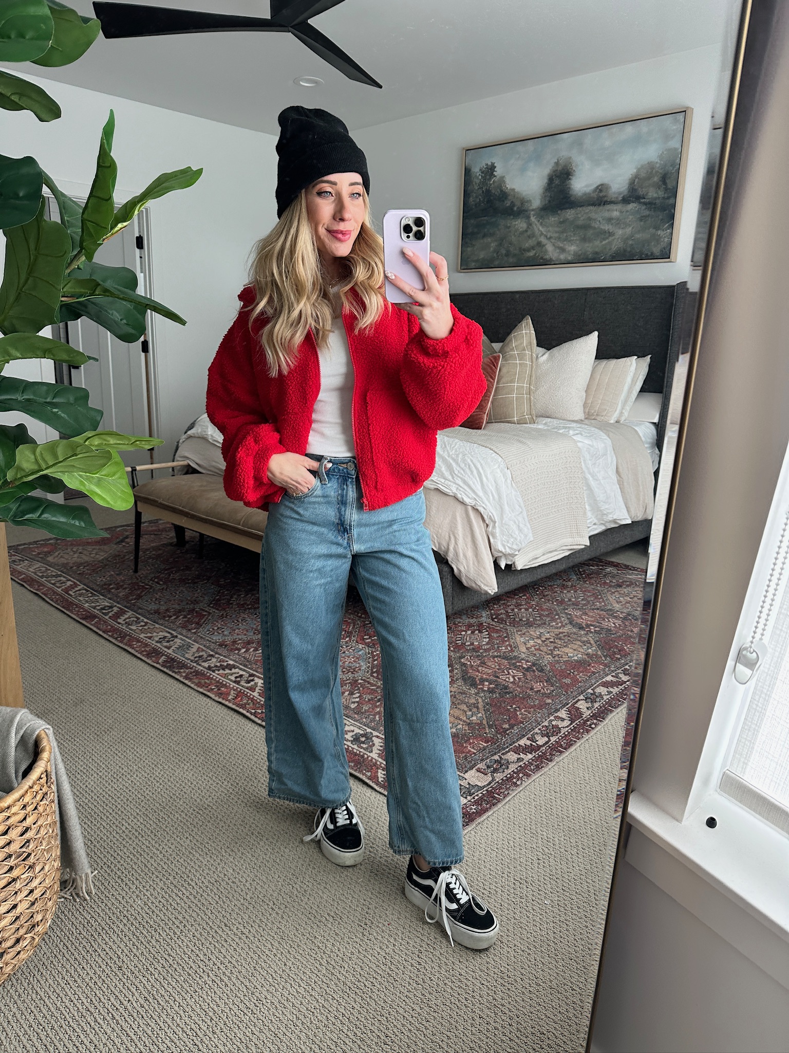 I love a good vest, it can easily elevate any outfit! And this red fleece, the pop of color is so fun!!