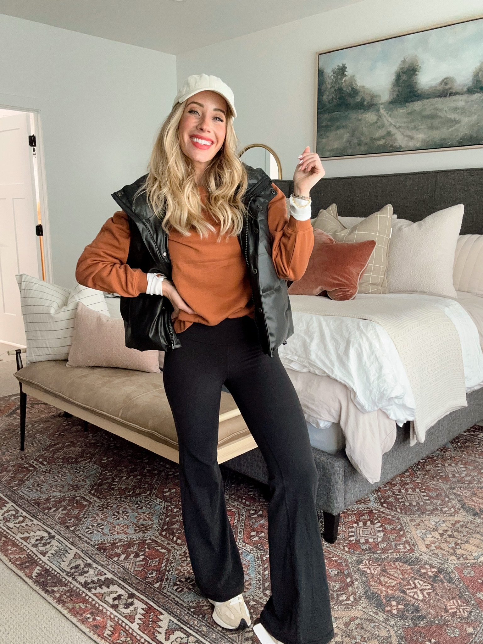 Flared leggings, sweatshirt, sneakers – perfect mom uniform all season long! Can’t wait to wear this sweatshirt so many different ways!