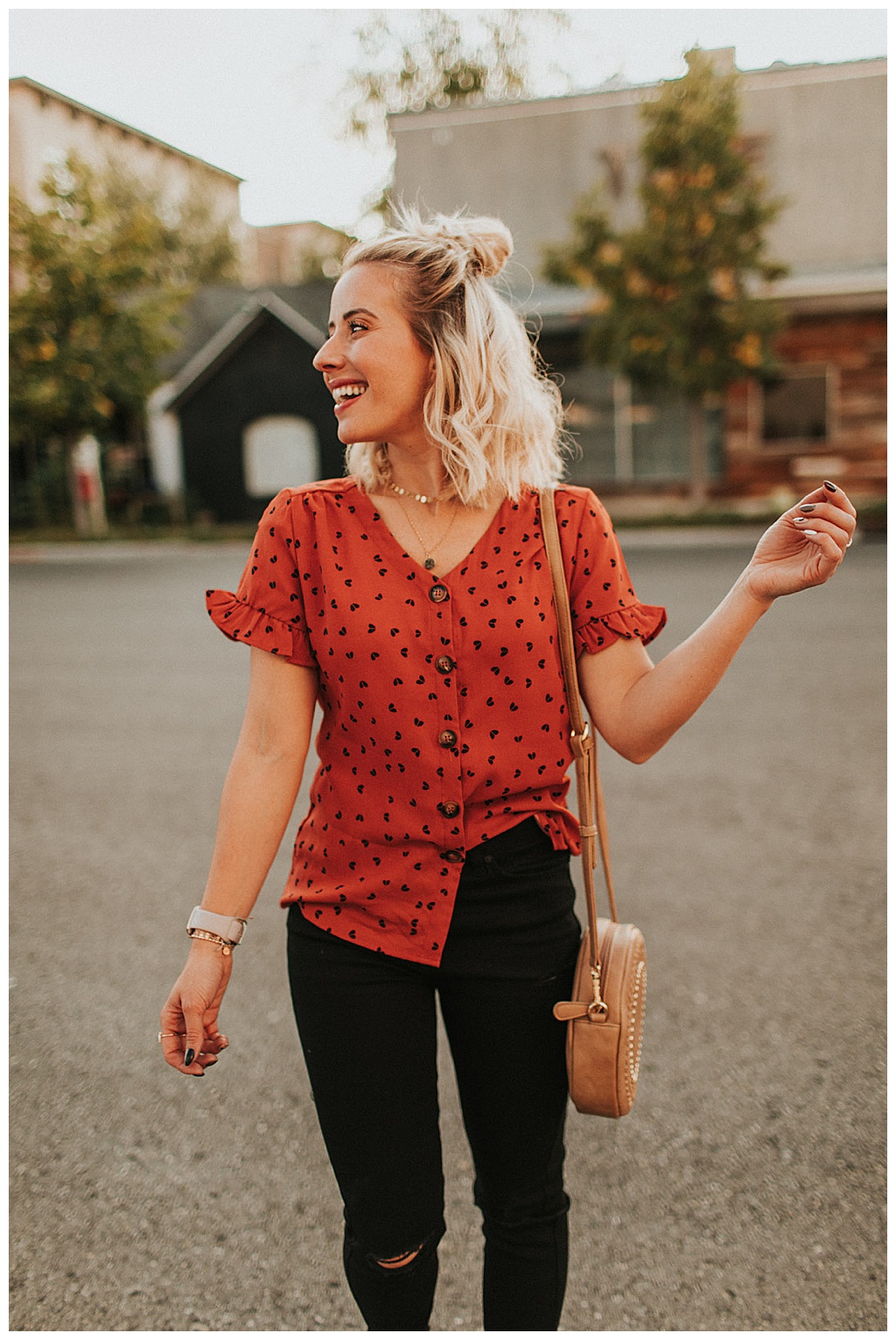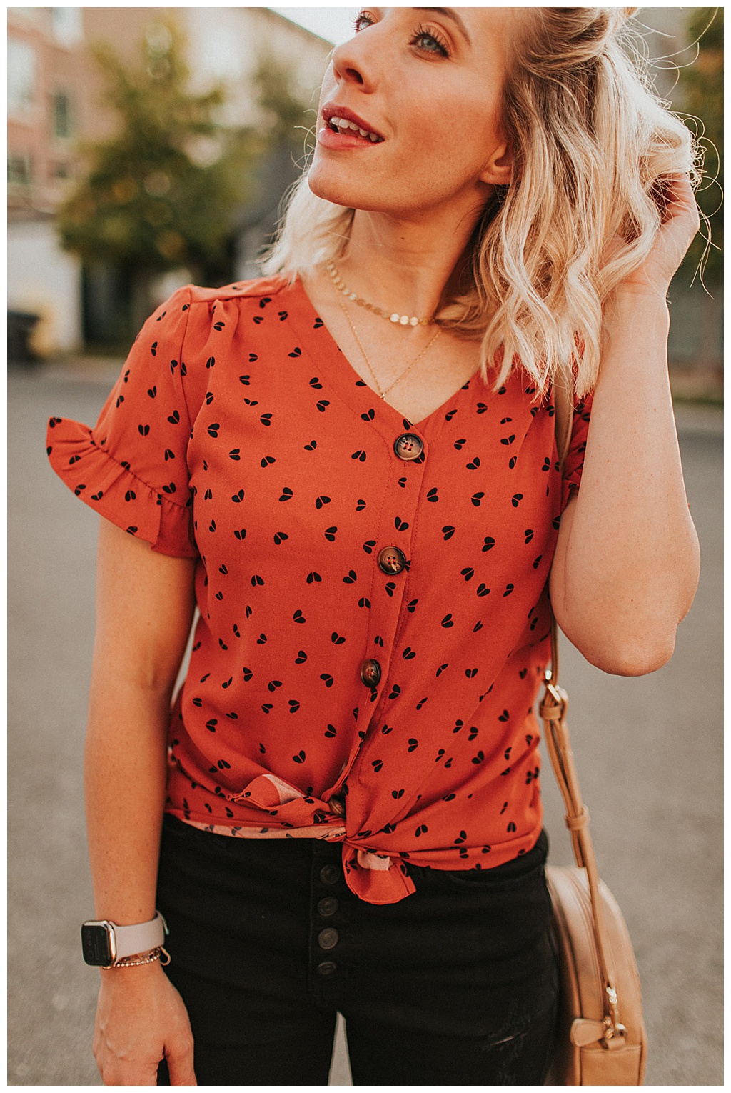 It is my favorite color. I love the polka dots. It has a little longer of a short sleeve WITH ruffles. So if you don’t love showing your arms? This shirt is going to be PERFECT for you!