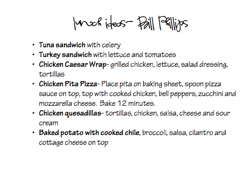 The great thing about Pinterest is it causes you to be inspired. The last few weeks I’ve been working on printing all my recipes from all my random recipe books. This is a recipe card I typed up from the Bill Phillips recipe book for healthy lunch ideas. Good to just have on hand.