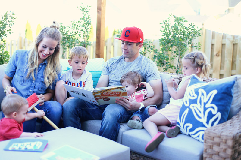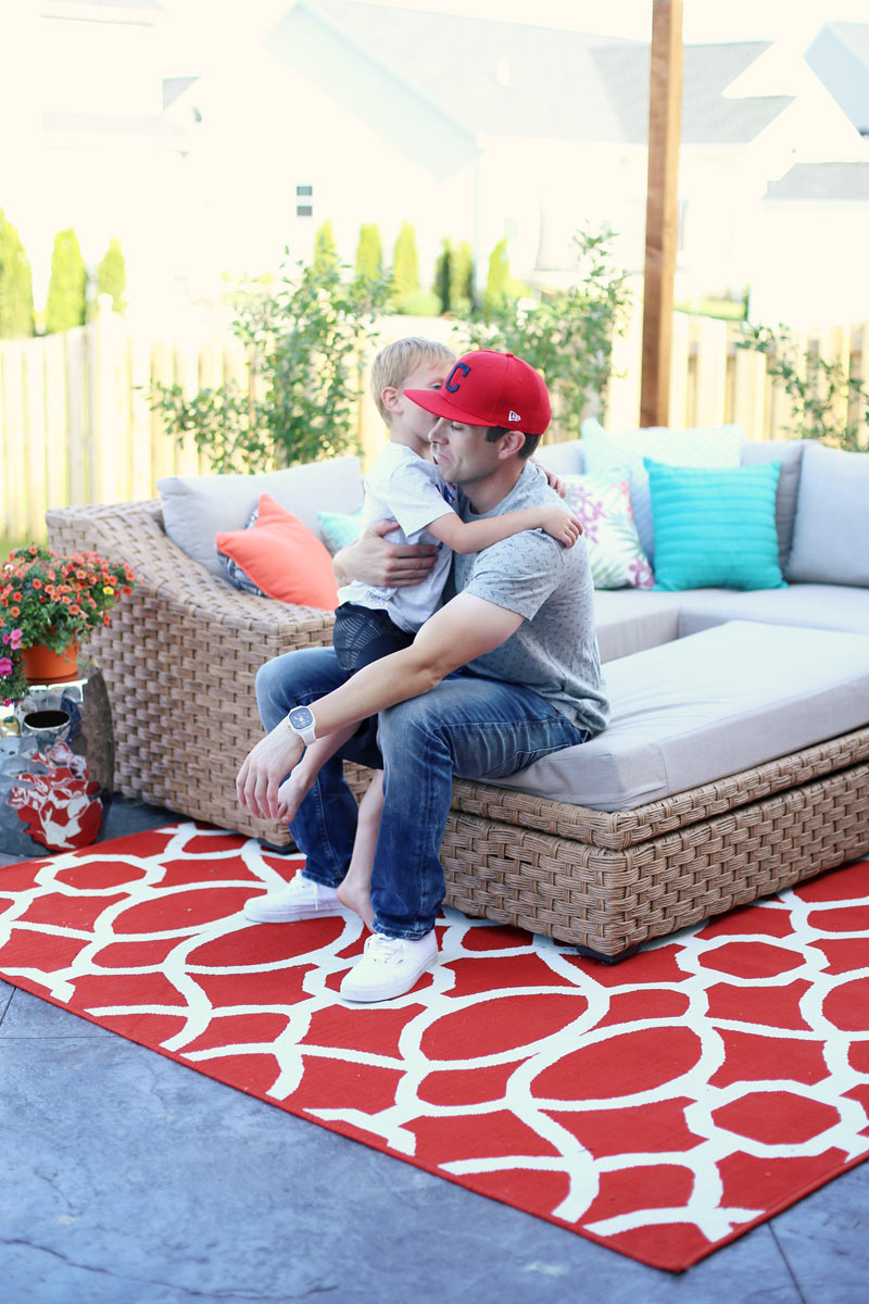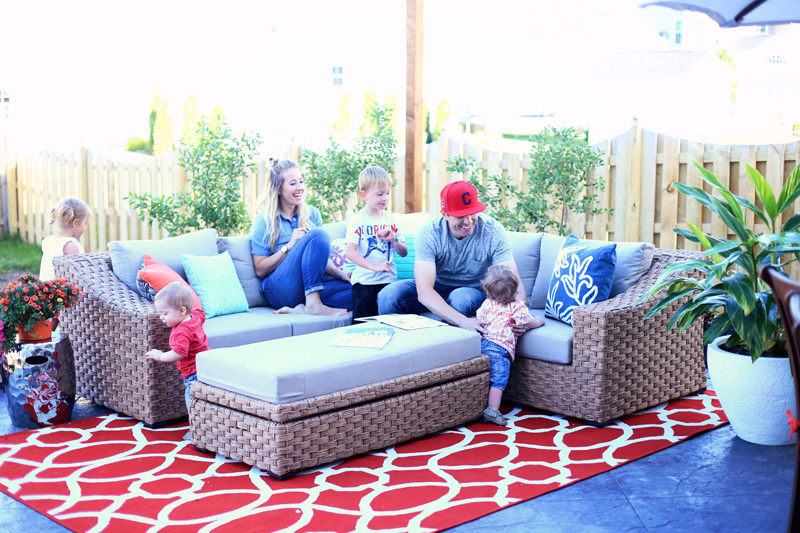 There was nothing inviting about our patio before. The stamped concrete is a cold grey color and I knew if I wanted my kids to want to be outside, I needed to create a space they felt warm and cozy in. So I brought in an outdoor rug to break up the cold grey color and then I found this gorgeous wicker sectional from AE Outdoor. To say we’re obsessed with it is an understatement. It adds in that warm, rich color I was desperately needing and it’s crazy comfy. I catch the kids reading to each other out there all the time! We now have family night outside, and soon we’re getting a little projector so we can have our movie night out there too! The fabric on it is Sunbrella so I’m confident this will be a piece we keep around for years and years. It’s soft and comfortable to lounge around in + the coffee table opens up to reveal awesome storage for throw blankets, books and toys.