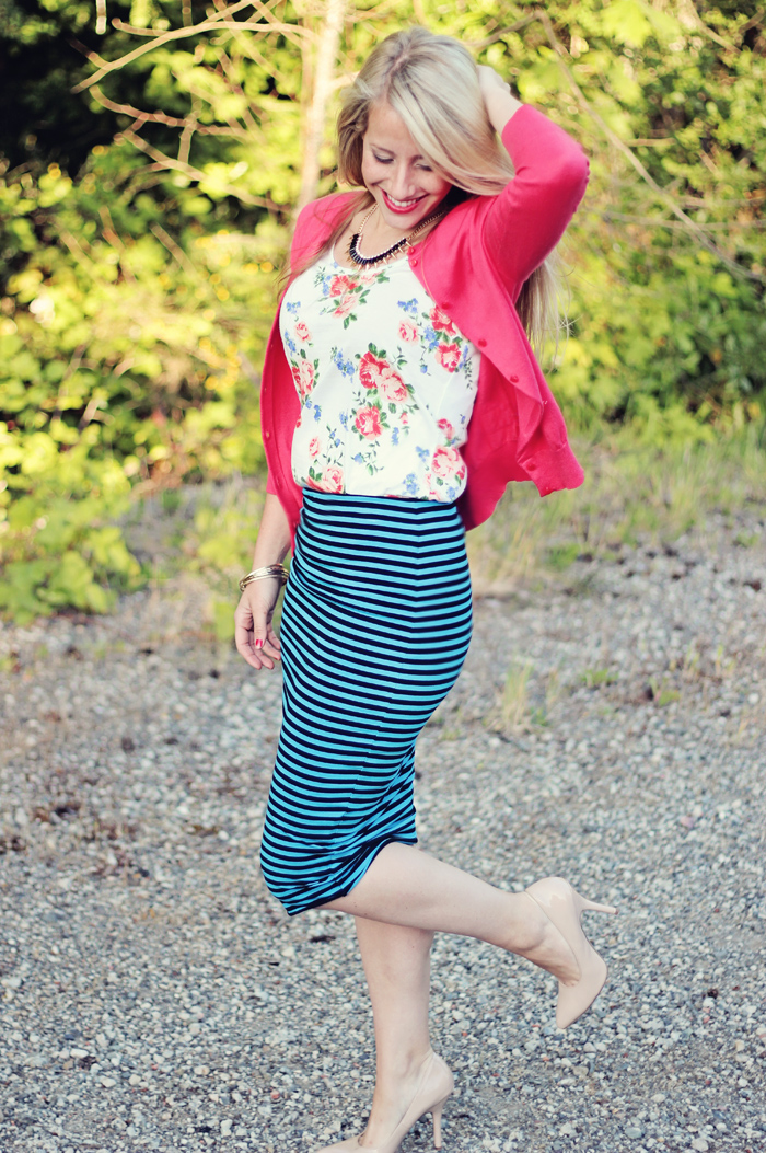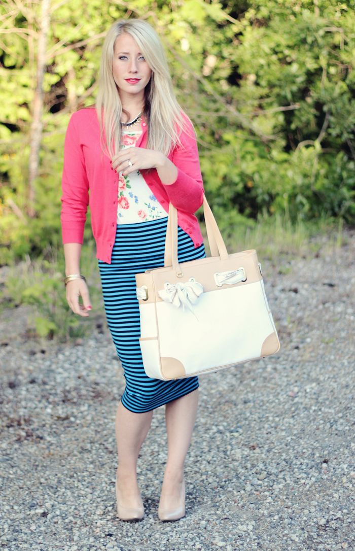 Skirt- Nordstroms (I’m usually a small and I bought an xs) Floral tank top: Forever 21(s) Cardigan- JCrew Factory(s) Pumps: Target Necklace: c/o Outfit Additions Bag: c/o Parazul
