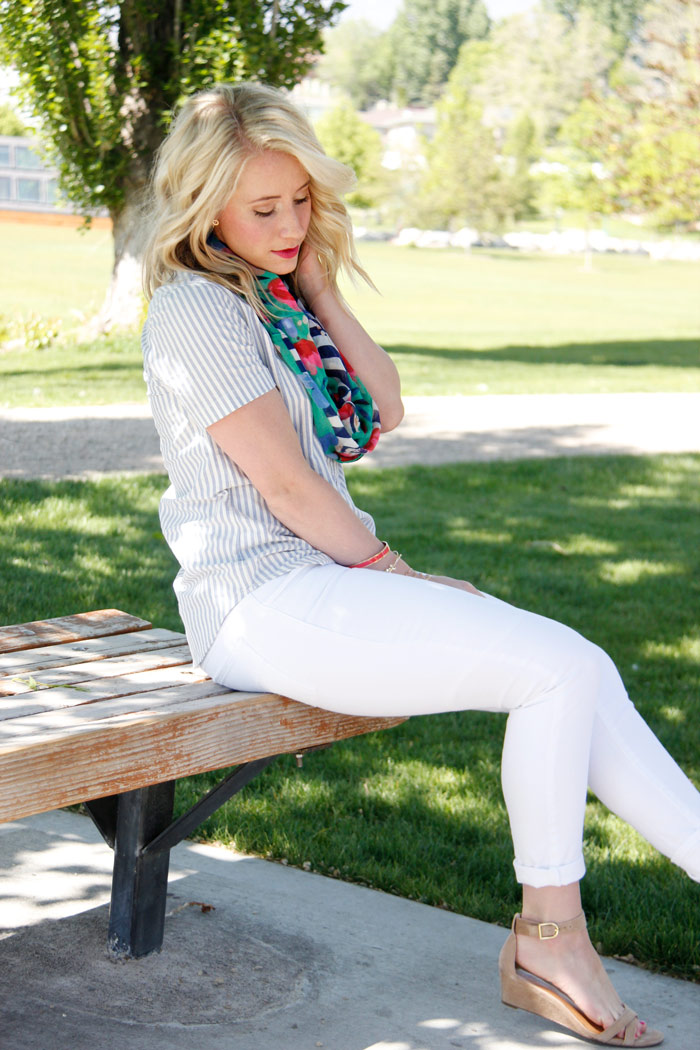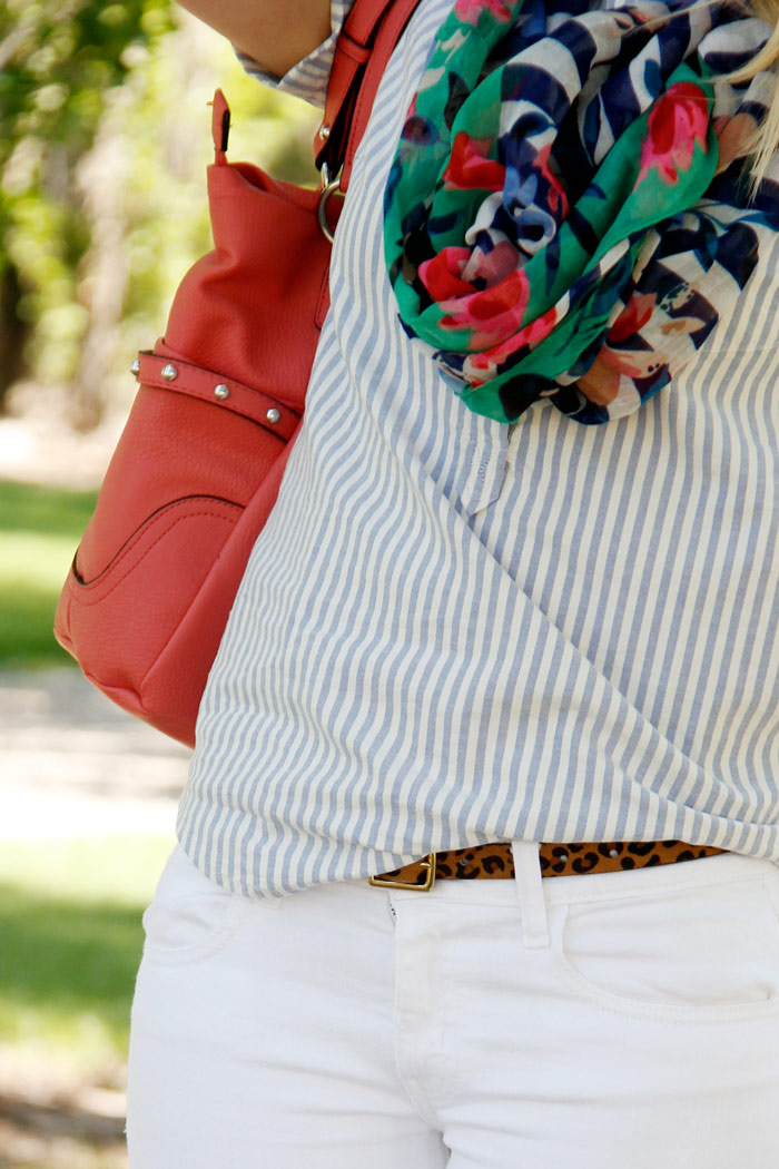 Top: Jcrew Factory Wedges: Jcrew Factory (I bought these on meeeega sale) Jewelry: c/o Kohls Scarf: Kohls Handbag: Zappos