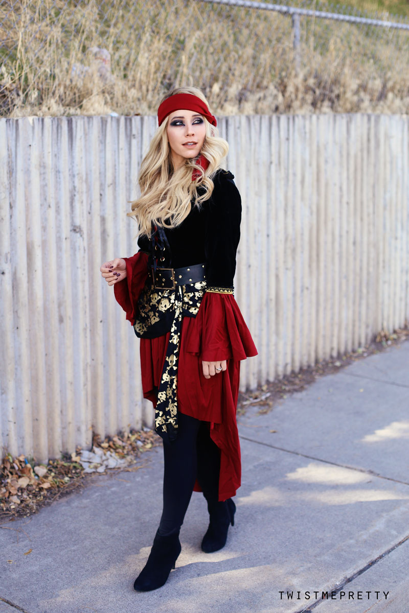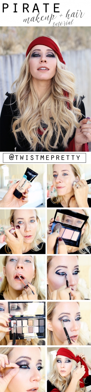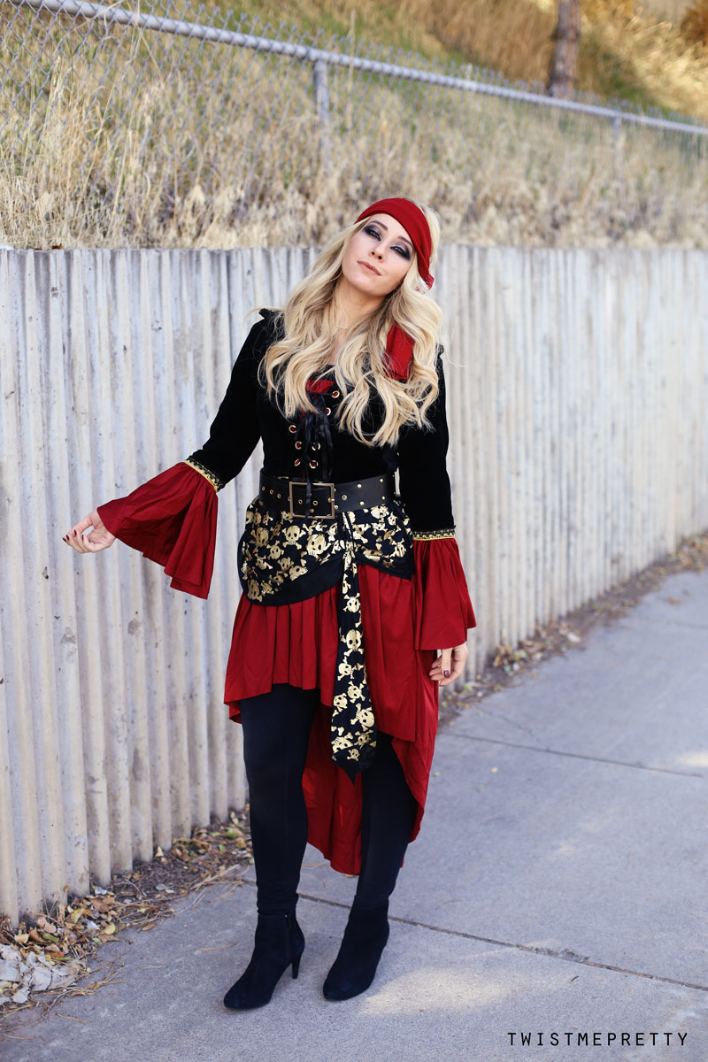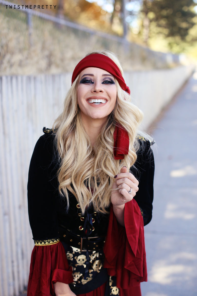 Ahoy, there me hearties! Welcome to the ultimate pirate costume, complete with makeup tutorial, bouncy curl how-to and of course the classy Halloween costume! After a couple of pretty intense tutorials, I thought it’d be fun to mix it up and share my take on a classic favorite. What do you think?! It’s definitely a fun eye look and one that can be worn throughout the rest of the year with a few slight tweaks!
