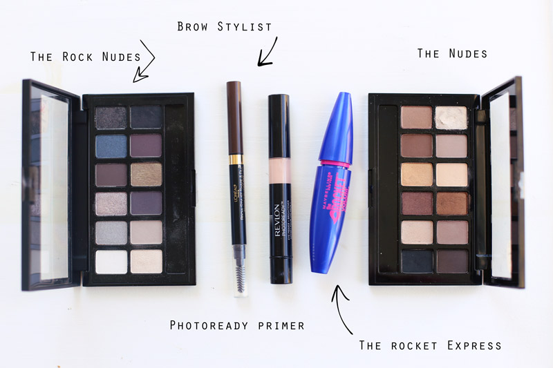 I like to fill in my brows with the Brow Stylist Shape and Fill by L’Oréal, I have the dark brown color. Then I love the Revlon photo ready eye primer and brightener to prime the lids. You can apply this directly onto the lid or you can put it on a brush and apply it that way!! I love the Maybelline Nudes palette! I have the rock nudes and the original nudes, both are so pretty! Those lighter colors you’ll want to apply wet, they’ll have better color payout that way! And then the rocket express mascara from Maybelline is bomb.