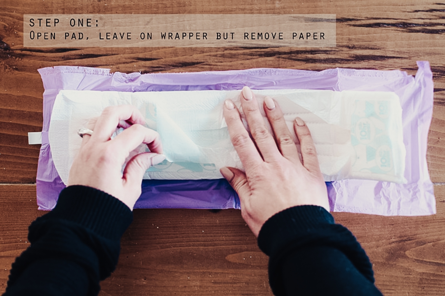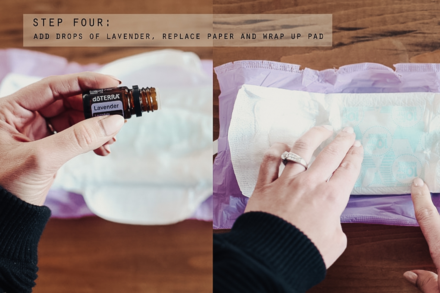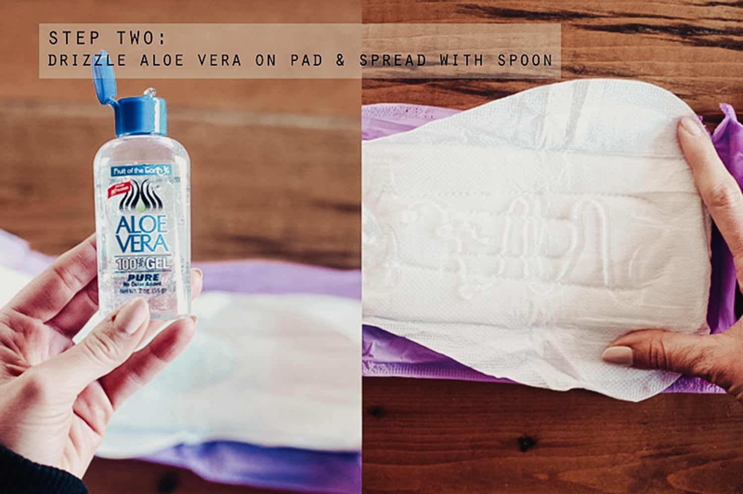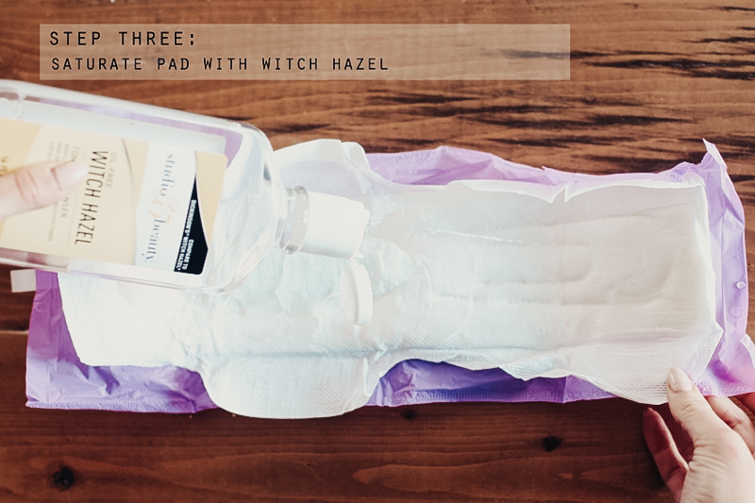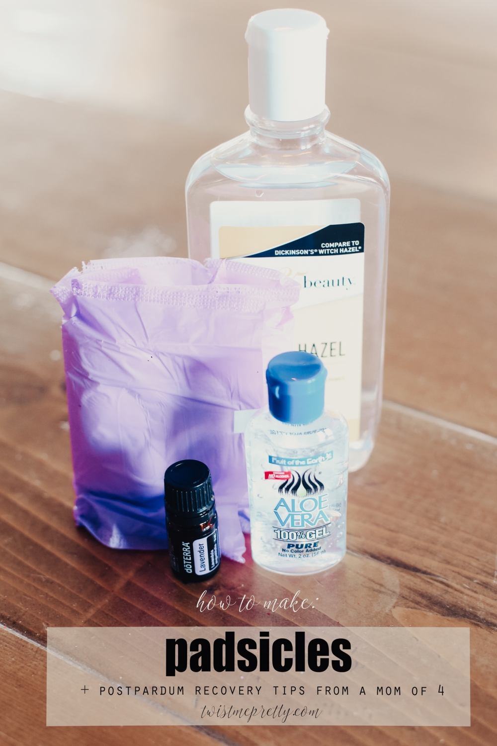 What you’re going to do is open the pad (don’t take the purple wrapper off the pad so it’s still sticky when you go to use it), take off the paper, drizzle aloe vera gel onto the pad, then saturate the pad with witch hazel and then sprinkle a few lavender drops onto the pad. Put the paper back onto the pad, fold it back up and stick it in the freezer. When you get home from the hospital, use these when you’re hurting. They’re going to help with the swelling and pain!
