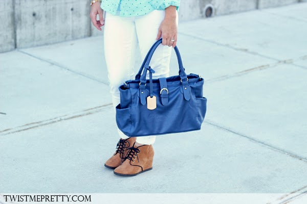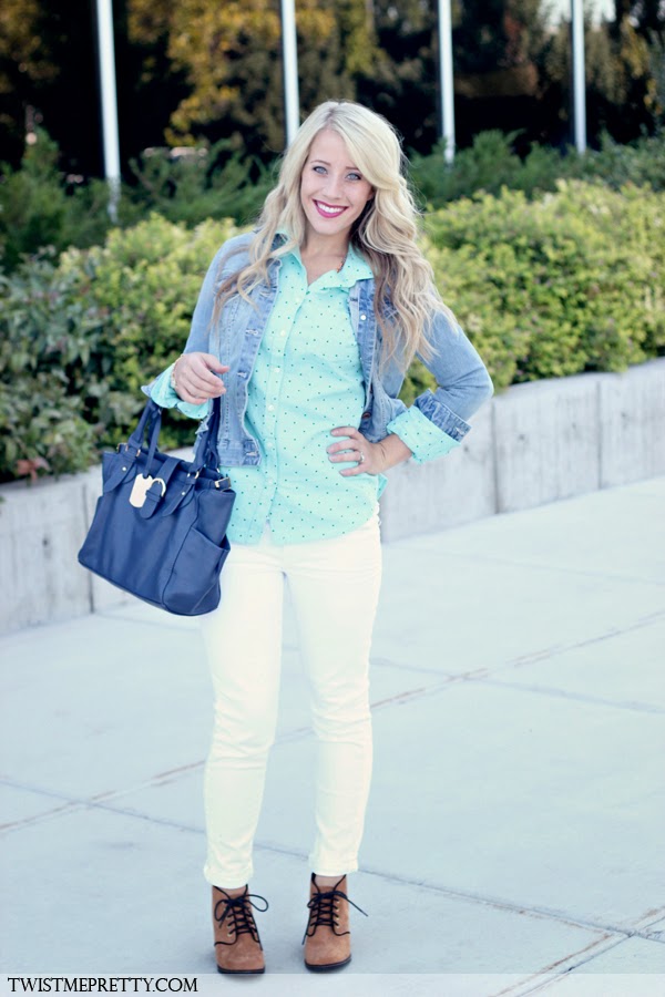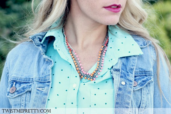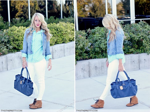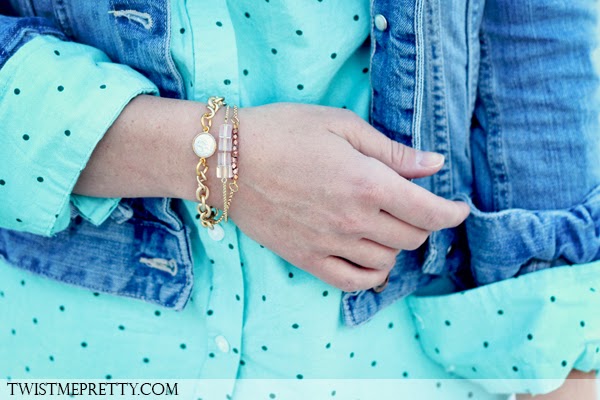 Leather Bag: c/o Persun Mall | Necklace: c/o T + J Designs | Bracelets: The Shine Project | Polka Dot Shirt: Target | Denim Jacket: H&M | Jeans: American Eagle | Booties: Forever 21