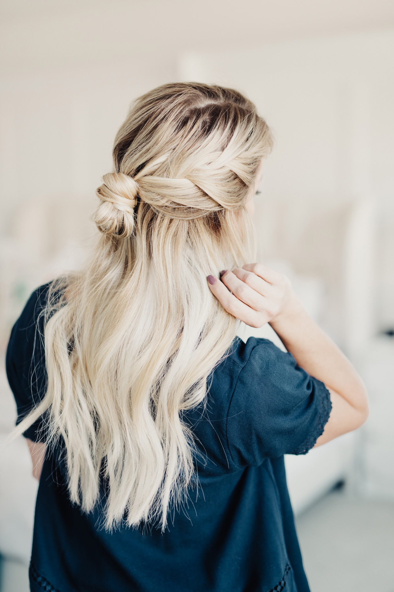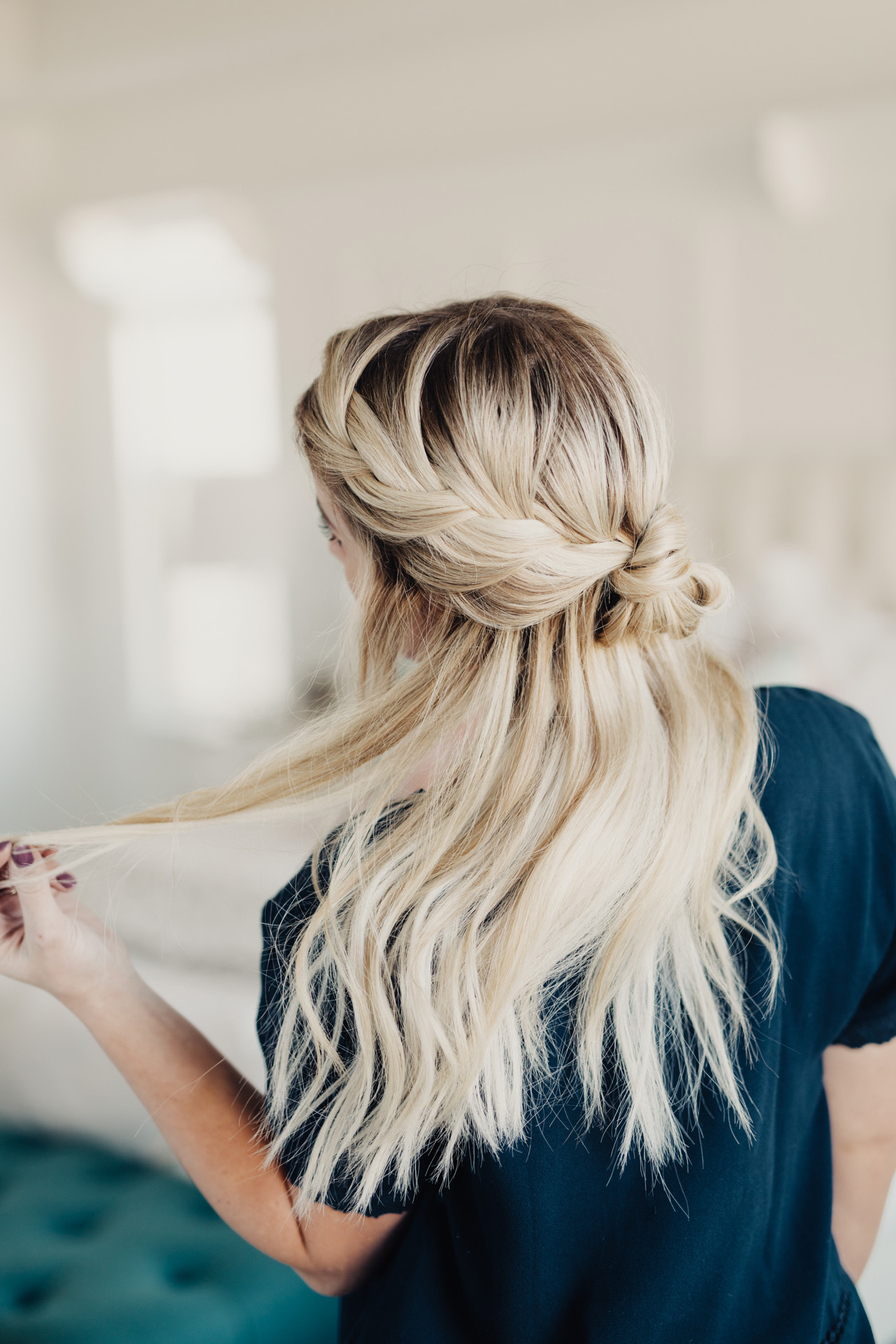 8// Tie the combined braids into a half bun, with the ends of the ponytail draping over the bun