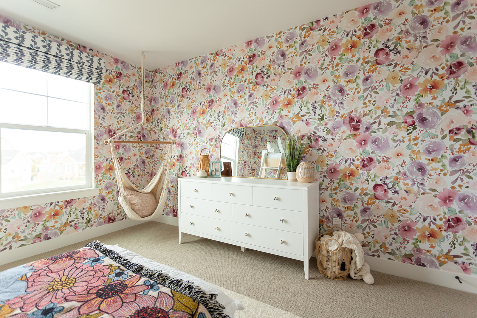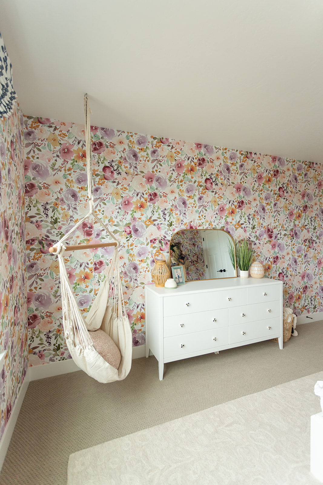 We started with the wallpaper. It was our jumping off point. It combined the beautiful florals the girls and I love, with some whimsy that reflects their young ages. I was super nervous to wallpaper the whole room. I had to take a deep breath and trust Kelsey when she suggested we do all 4 walls. As I expected, Kelsey was right and it turned out beautifully!