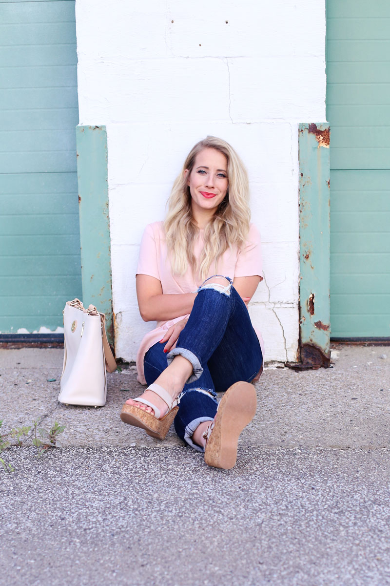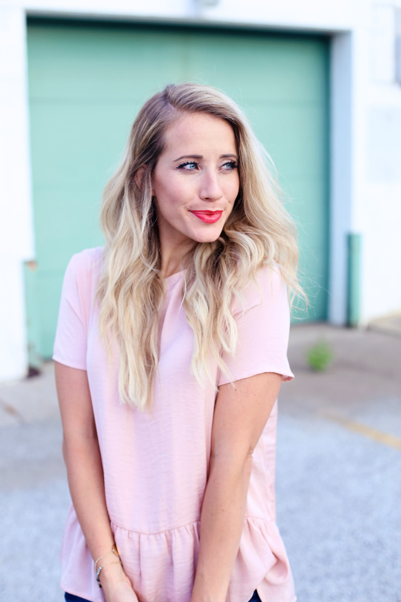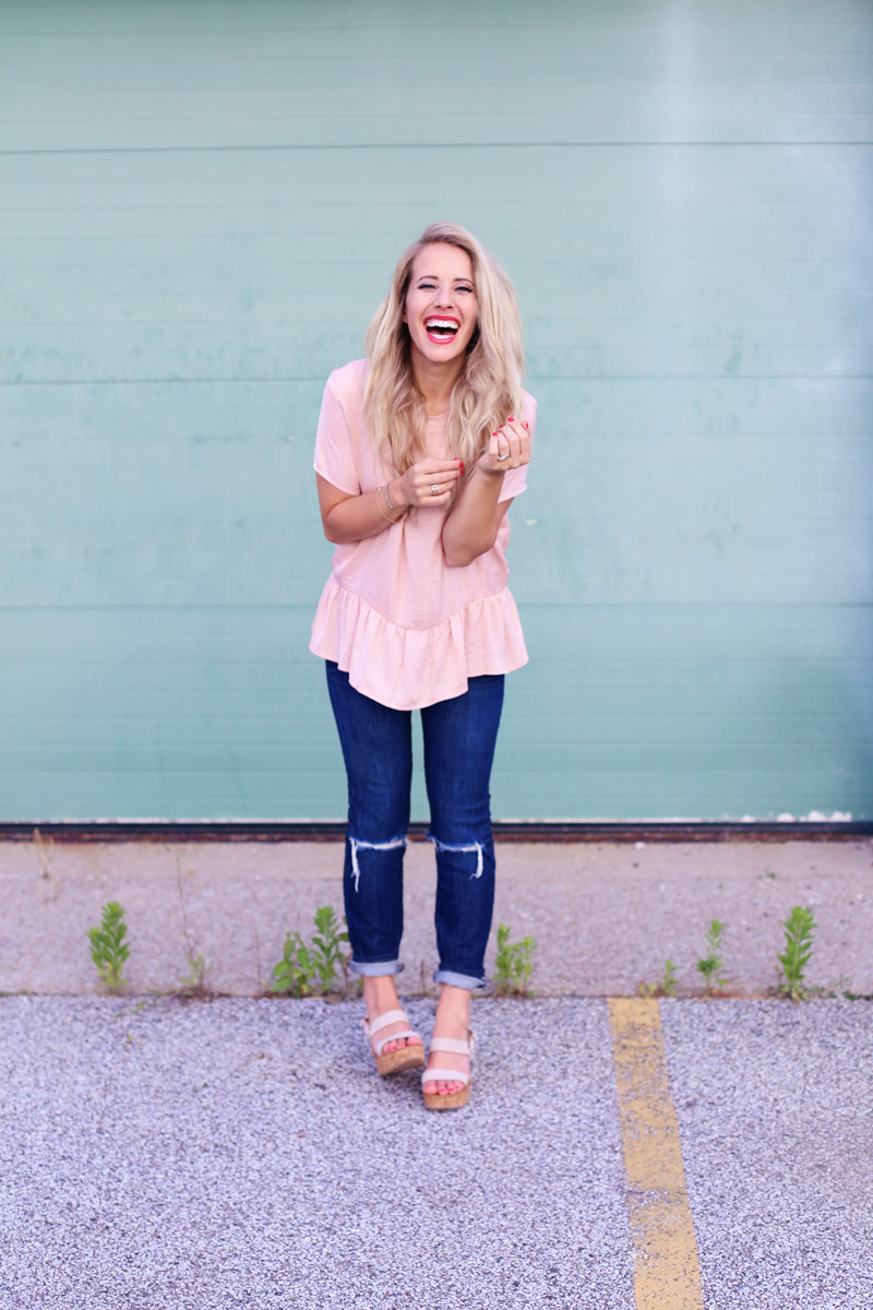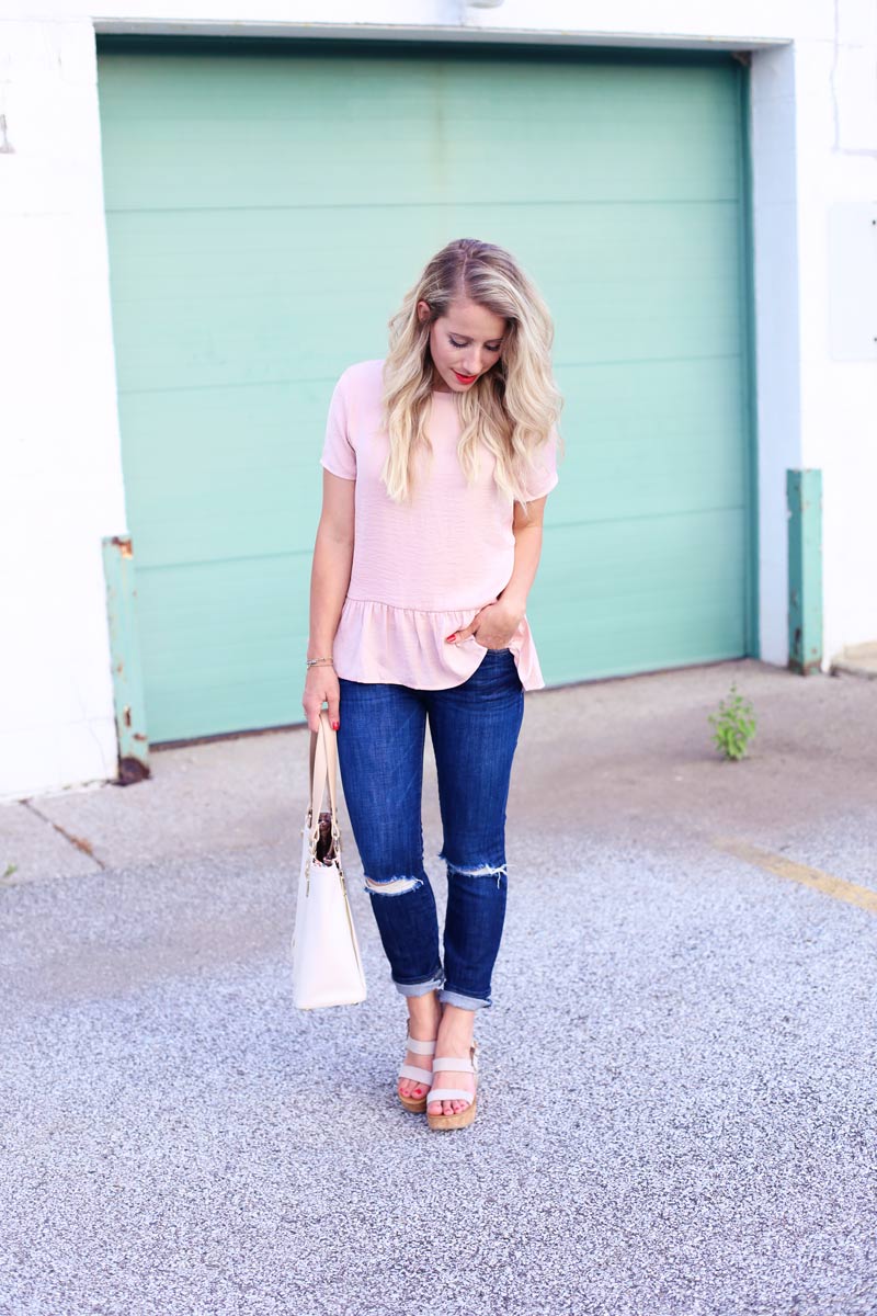 Current Elliot Jeans – c/o thredUP | St. Tropez Wedges – c/o ThredUP | Pink Peplum Tee – Target | Lipstick – LipSense in Strawberry Shortcake | Bracelets: c/o The Shine Project | Bag: c/o Spartina 449