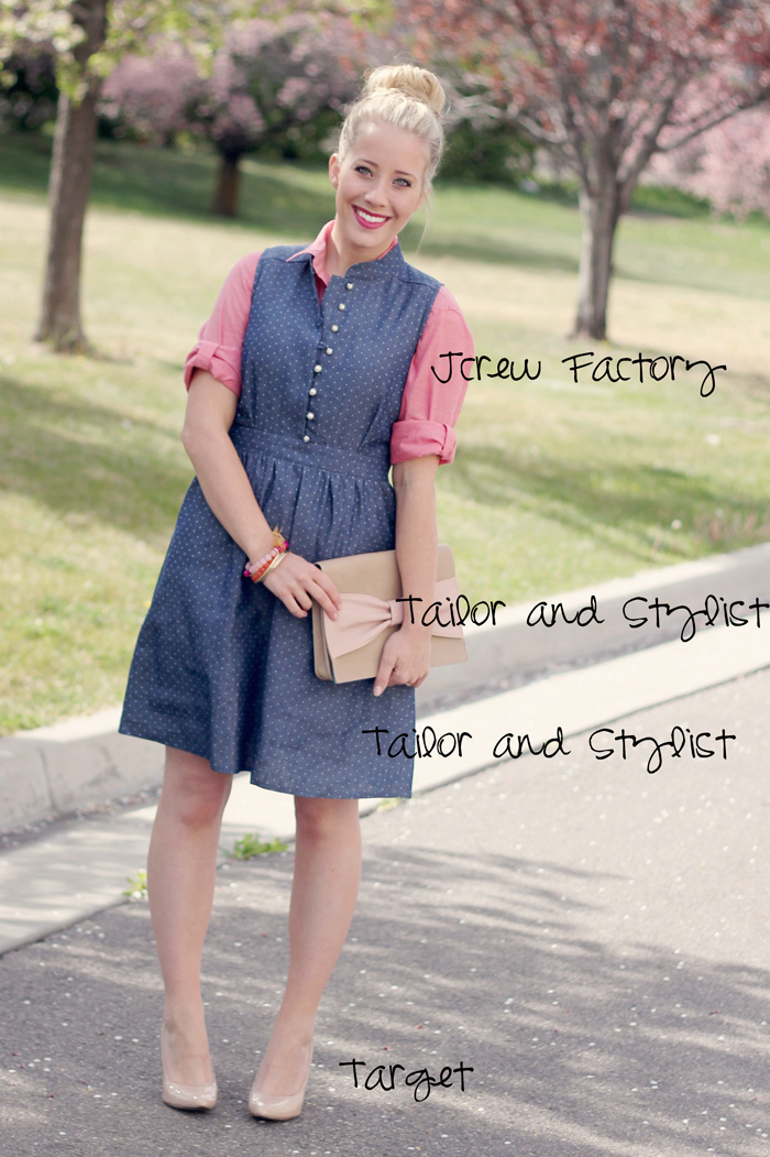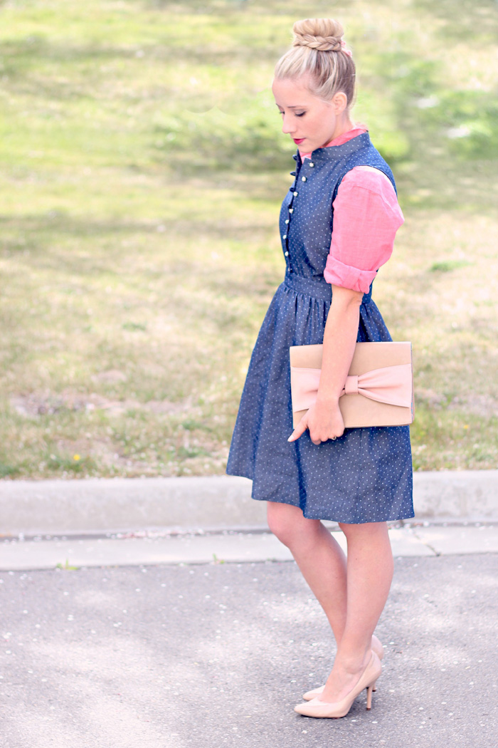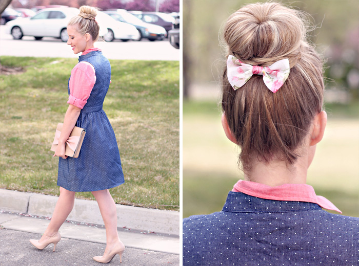 This denim dress was a bit short on me so I unpicked the hem and found an extra two inches! I love the polka dots and the set-in waste band- so flattering. It’s super light and so perfect for summer! I’ve layered mine with a colored button up stolen from my sister and some nude heels. If you’re curious on the hairstyle, go check out the tutorial here.