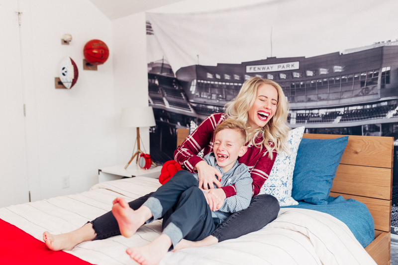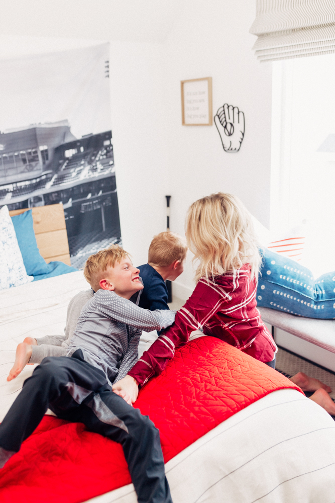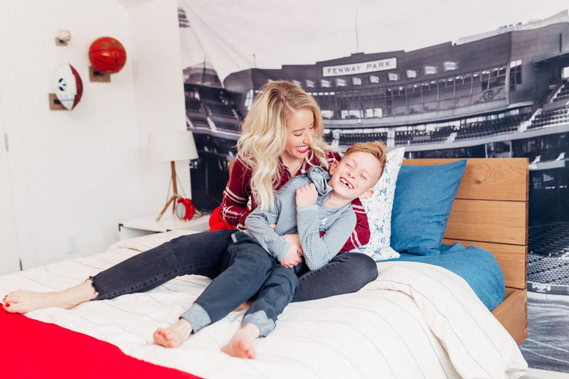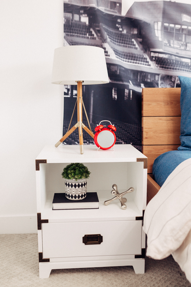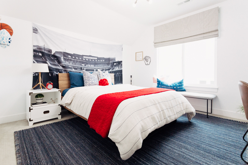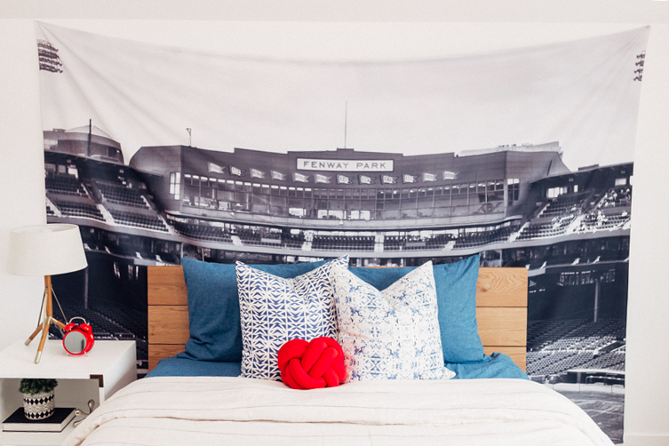I actually found this tapestry from Red Bubble and it became the inspiration behind the room! I loved it because we named Boston after the Red Sox, Brian is a huge fan of Boston and we just ultimately thought it was a cool name. So to have a little Fenway Park tapestry in this sports obsessed little boy room, we thought it was perfect.