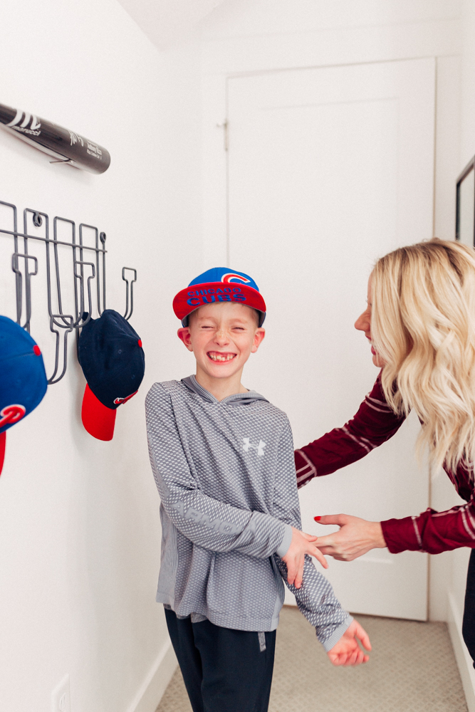 I snagged two large and one small wood ball holder from Pottery Barn and they’re the perfect addition to help Boston display his favorite balls. His football is signed by the BYU football team and then that’s the baseball that hit him in the face when he was four!