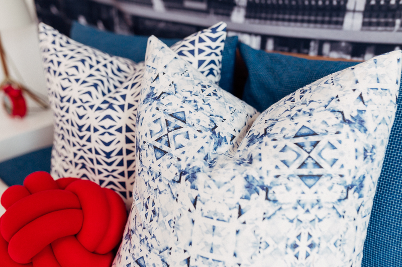 Could you not die over this fabric? These are Savannah Hayes textiles and I can’t tell you how obsessed I am. We tossed around other pillow arrangements (… haha see what I just did there?!) but couldn’t stop dreaming over these two pillows from Savannah Hayes. We ordered 1 yard of the Lisbon fabric and another of the Palermo, both in the color Indigo.