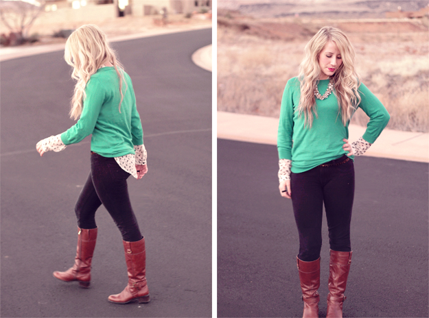 | Sweater: JCrew- gifted. Out of stock but loving this one) Patterned button up: Macy’s Necklace: Forever 21Boots: Macy’s Jeggings: American Eagle Belt: Banana Republic Lipstick: Maybelline 24 hour color stay, All Day Cherry |