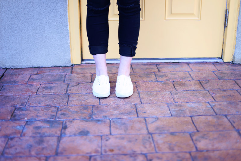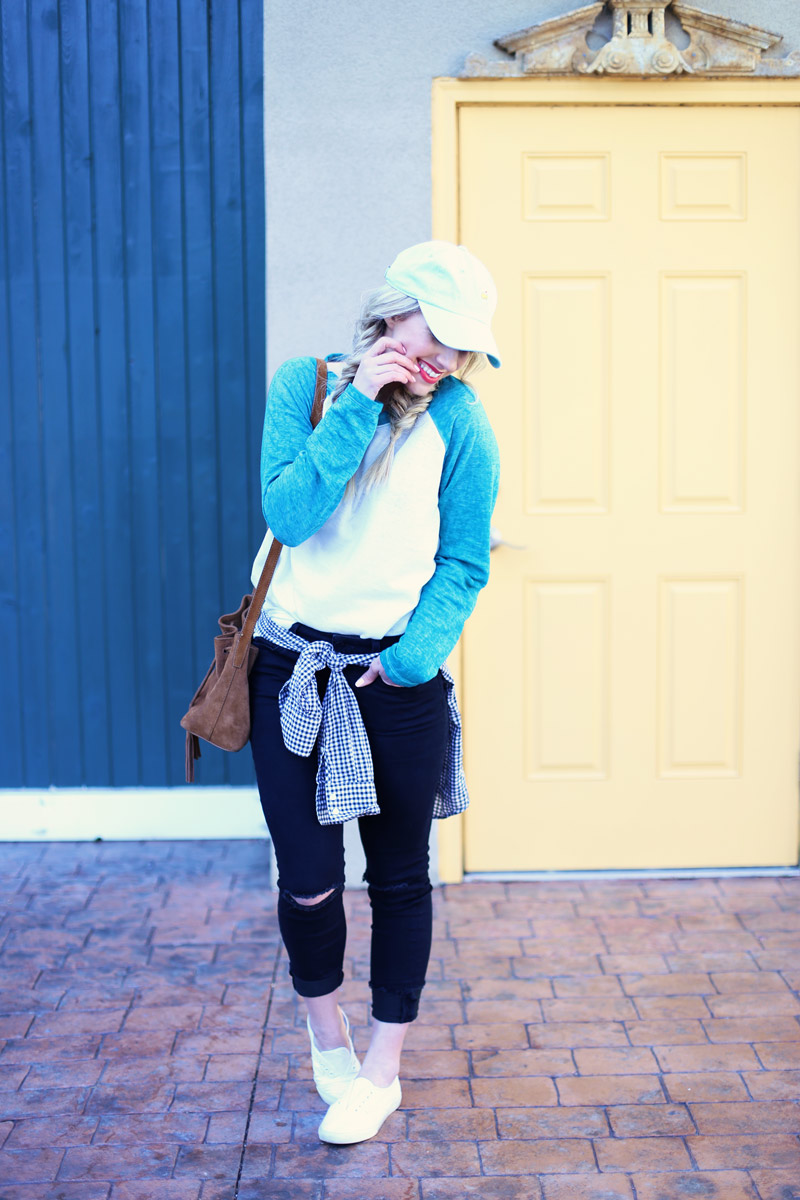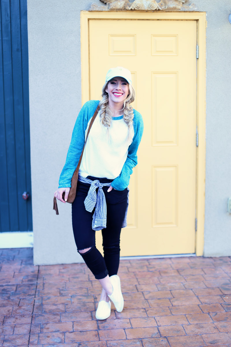 You know what a momiform is right? It’s the outfit you wear for comfort and practicality while chasing your kids around all day. These jeans are basically leggings, the top is soft and warm + tying a button up around the waist is always a good move for me. The hat because I haven’t washed my hair in 100 days and the fishtail braids because my hair was so dirty I couldn’t even get a messy bun to look cute! All of these things equals the perfect momiform! I’m obsessing over this baseball top – it’s a little pricey but it’s because it’s not a t-shirt, it’s a sweatshirt and a suuuper soft one at that. I found a really cute baseball tee at American Eagle that’s on sale right now though, so make sure to check that one out.