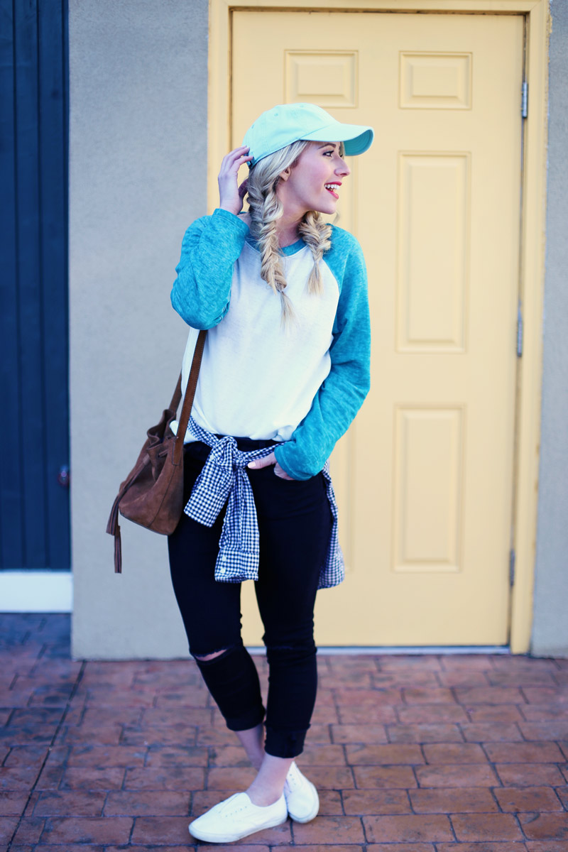 Styling a Baseball Tee ||| Baseball top: here similar here and here | baseball cap: here and here | Keds: here | Distressed Jeans: These are the exact ones I have, and they’re so amazing but they’re almost sold out!! I found them on Amazon here if you want the exact ones or here are some very similar ones! And they run true to size! | Gingham Shirt: here | Bag: here (only black available) similar here | Lipstick: here color all fired up