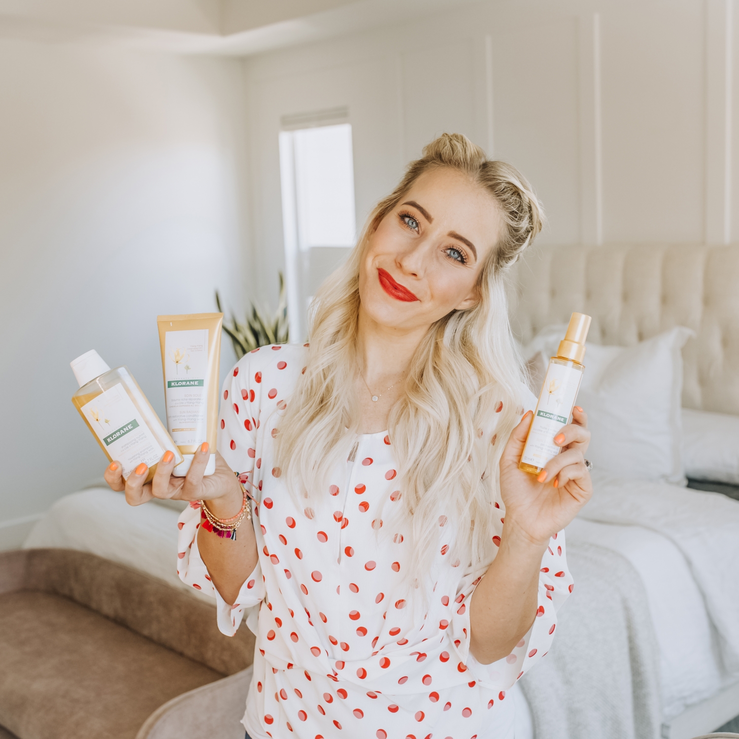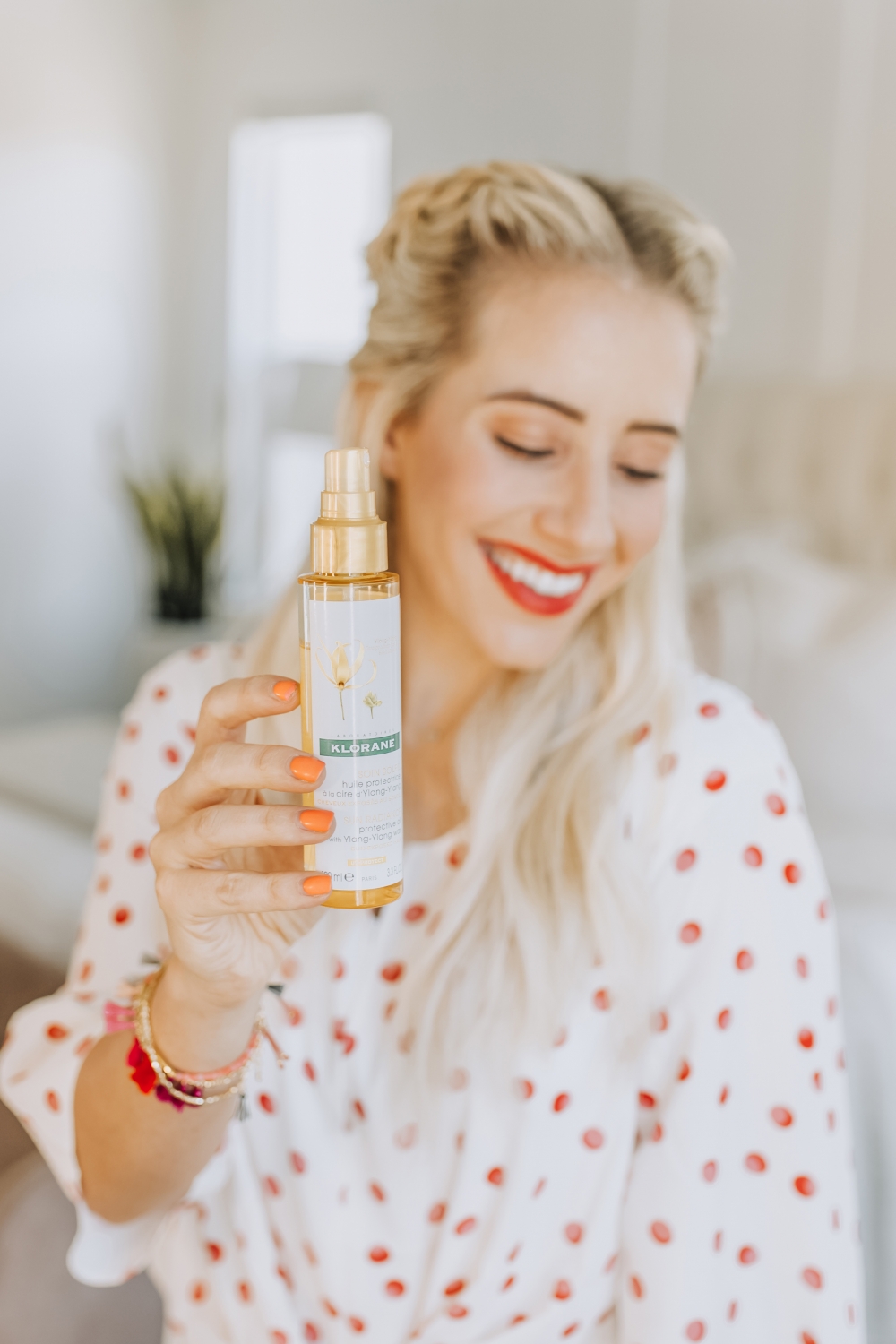 While we’re on the topic of summer, I wanted to share with you guys one of my new favorite collections from Klorane! This line is infused with ylang-ylang wax and developed to protect your hair from the summer elements like the sun, wind, salt and chlorine! I don’t know about you, but my hair can get wrecked in the summer if I’m not careful. My hair is typically dry — I am platinum blonde — and I’ve really gotta baby it in the summer so it stays healthy. The shampoo has been made to get rid of all the salt and chlorine and gunk that can get in our hair at the pool or beach and then the conditioner is extra creamy to add moisture back into the hair. And then you’ve got my favorite product (this makes my top 5 favorite product list!!) the protective oil. You don’t need a lot of this stuff, you can over do it pretty quickly so be careful and spray from further away adding more as needed. Just a couple sprays when it’s wet and a couple sprays when it’s dry and you’ll immediately feel a difference in your hair. Try to avoid the roots and like I said, hold it a littler further from the hair than you would other products. It’ll instantly transform your hair from a tangly, dry mess to super soft and shiny. It’s amazing. It acts kind of like a SPF for your hair too so it protects it from the damaging effects of the sun!!!