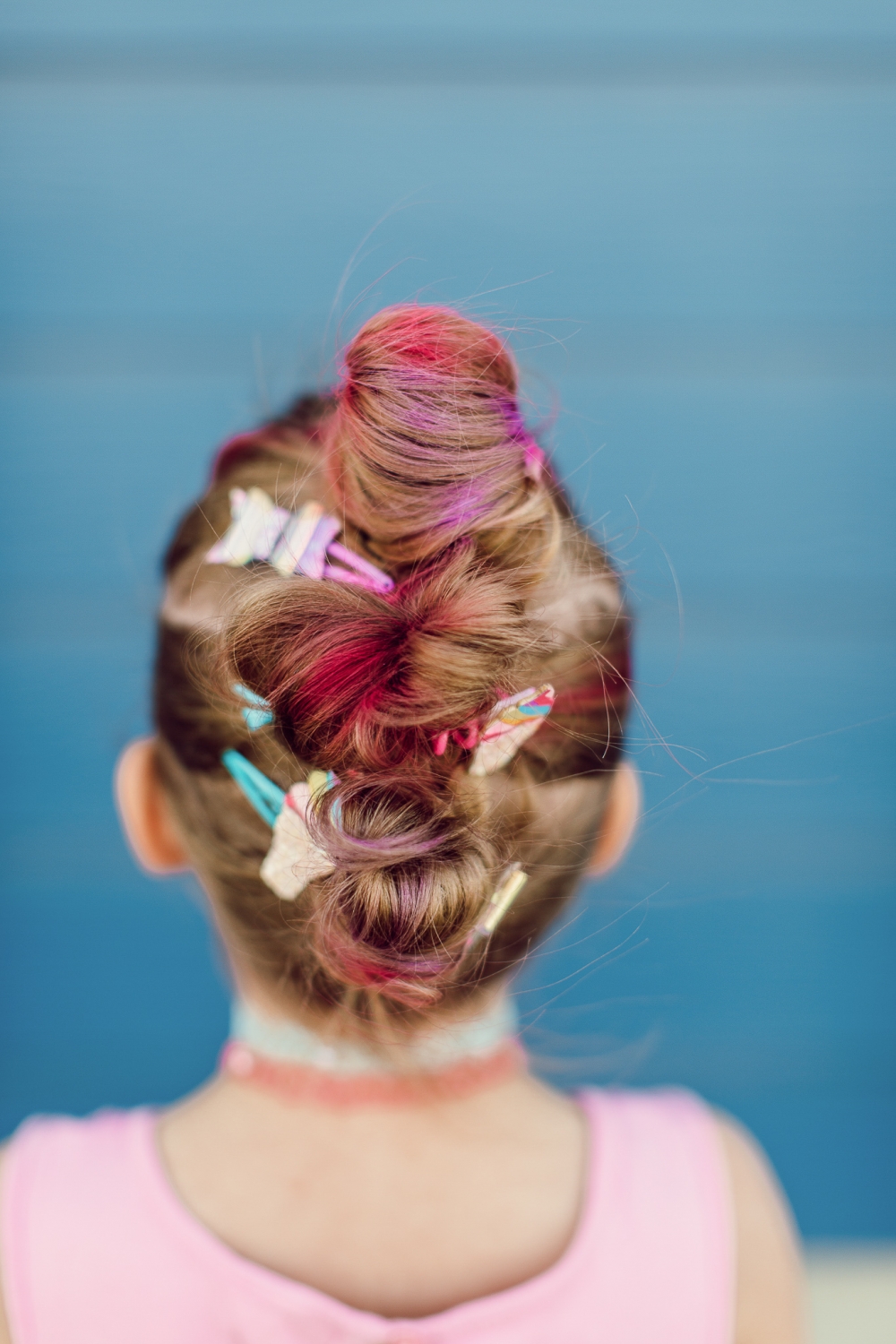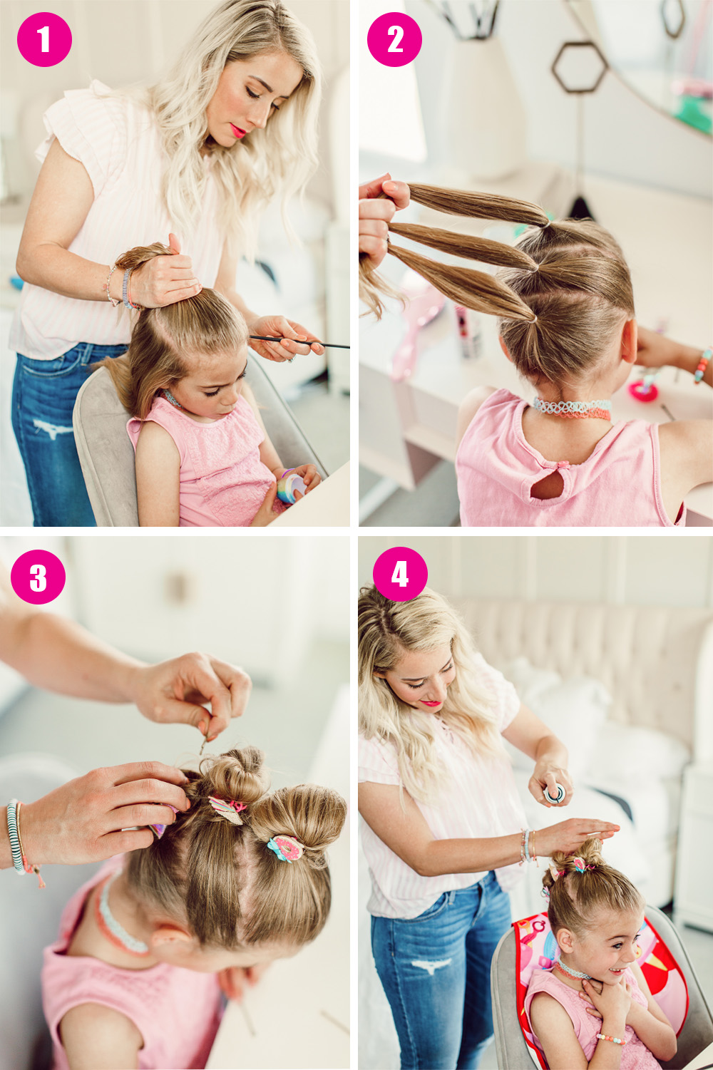 Step 2: Then I used the pink hair ties we made with the cute embellishments on them and put each ponytail into a messy bun.