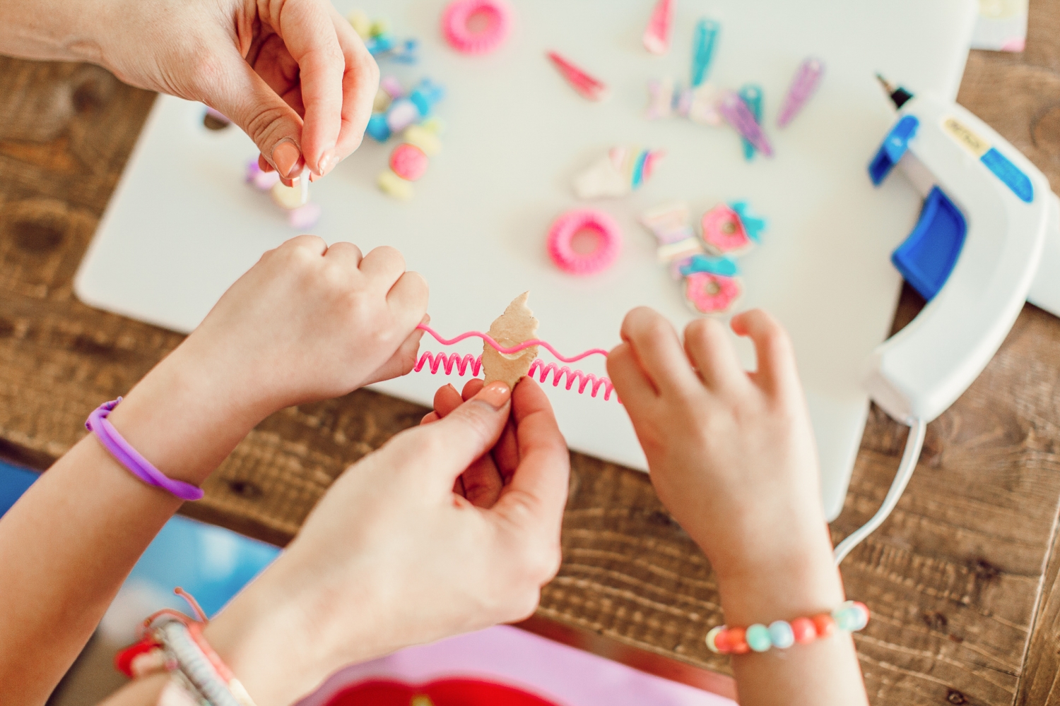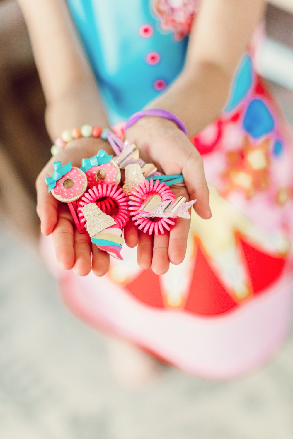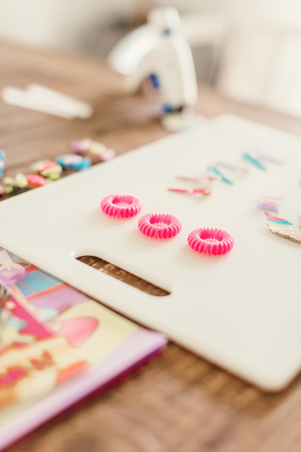 I snagged a couple scrapbooking embellishments from the craft store, a few clips and hair ties. I’ve really been loving the telephone cord hair ties! You can find them pretty much anywhere these days, these ones I picked up at our grocery store. I love them because they don’t leave kinks in the hair, but also because the ones we have are fun and colorful.