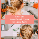 Savy and I did the cutest sweetheart updo a few weeks ago. It’s a very subtle nod to Valentine’s Day. If you look closely at the pictures, you can see how we created hearts in her hair. I love this look on her! It was really easy to do, with no braiding skills required. Do you want to learn how we did it? Keep reading and be sure to check out my YouTube video at the bottom of this post to see how quick and easy it is!