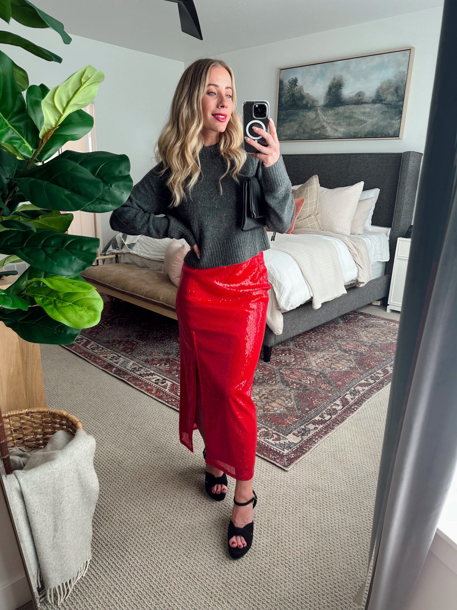 Here is this sweater in another color way! And also – this sequin skirt is so fun, but I just wanted to give all of you a heads up that the slit does go pretty dang high! I put a few stitches in it to make it a little more appropriate! I’d totally pair it with jeans and casual shoes too!
